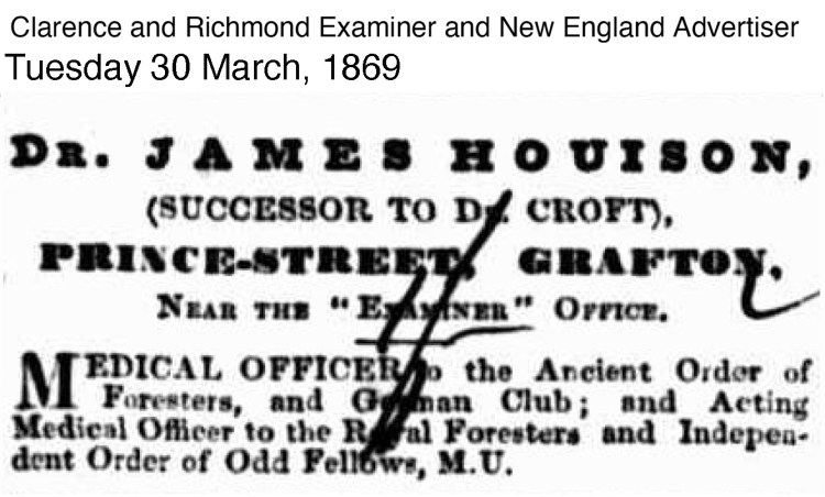In March 1869 a Testimonial dinner 3 was given for Dr Croft in Grafton ‘and before sitting down, he could assure them that they would find in Dr. Houison, his successor, all they could wish or desire.’