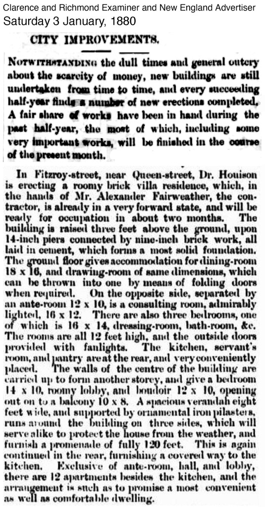 In 1880 what is later known as ‘Prentice House’, was commissioned by Dr James Houison; ‘This federation style residence, designed and built in 1880 by the well known Grafton builder Alexander Fairweather, is one of Grafton’s most beautiful and prestigious structures. Prentice House was commissioned by the surgeon Dr James Houison as a residence and surgery. The house was completed three months after Fairweather’s other project, ‘Telarah’ in Oliver Street Grafton.‘9