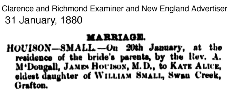 Dr James Houison returned to Grafton in 1876 and set up his medical practice there. He married Kate Alice Small of Swan Creek near Ulmarra, on 20 January 1880. James was 36 years and Kate 20 years.