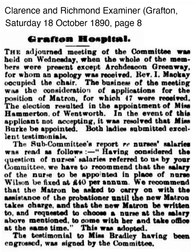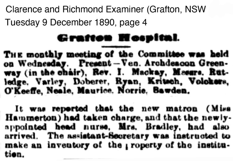 In 1890 a new Matron had been appointed taking charge of Grafton Hospital, her name was Miss Hammerton. At the same time a new Head Nurse, Mrs Bradley was also appointed.