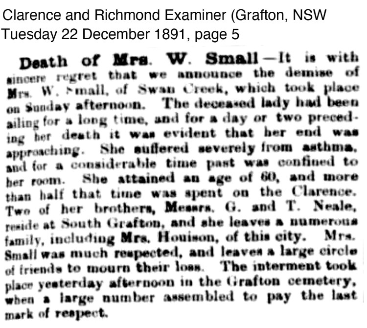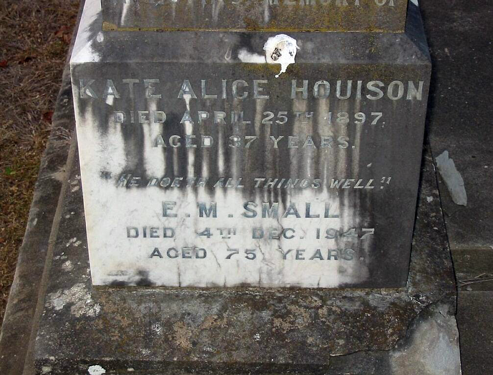 Kate Alice Houison nee Small is buried with her mother Elizabeth Mary Small nee Neale in Grafton Cemetery Lot 362.