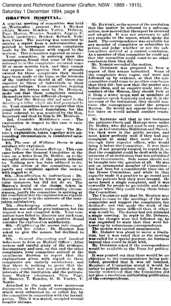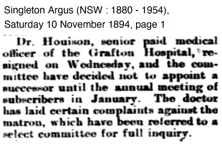 The resignation of Dr Houison and his submission of complaints against the Matron of Grafton Hospital caused quite a stir. The sub-committee of the Grafton Hospital Board in the end did not support the complaints by Dr Houison and backed the Matron.