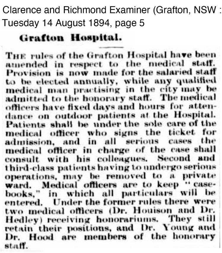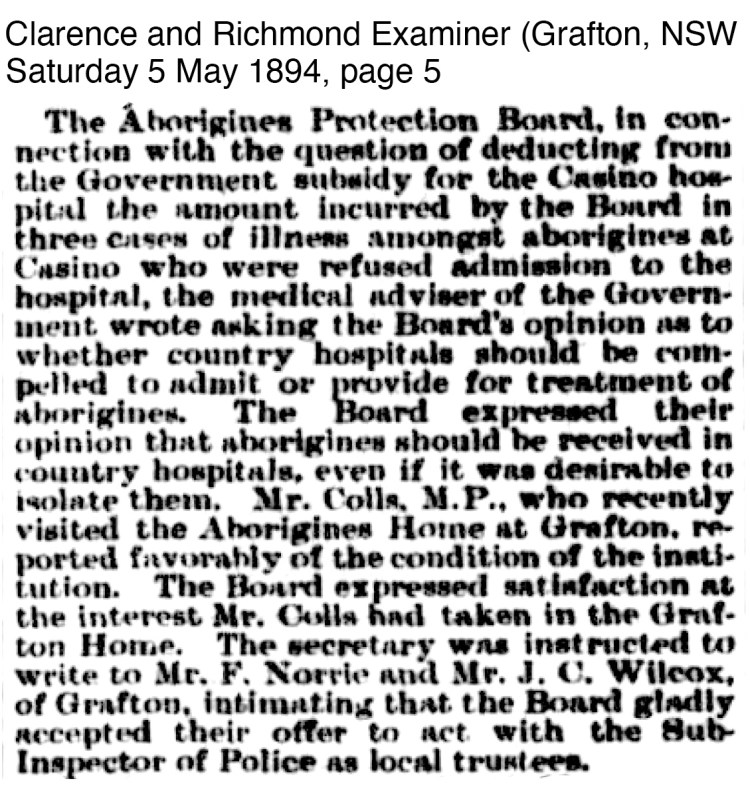 In May 1894, Dr Houison, who had been appointed the ‘Medical Officer to the Aborigines’ sent a letter to the Grafton Hospital Board which was discussed in the August meeting requesting clarification on the admission of ‘an aboriginal’ to which the Board would ‘make enquiries re the admission fo aboriginal patients’. This is despite a visit and directive in May 1894.