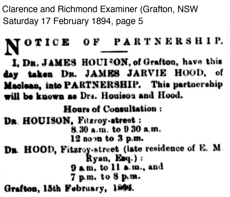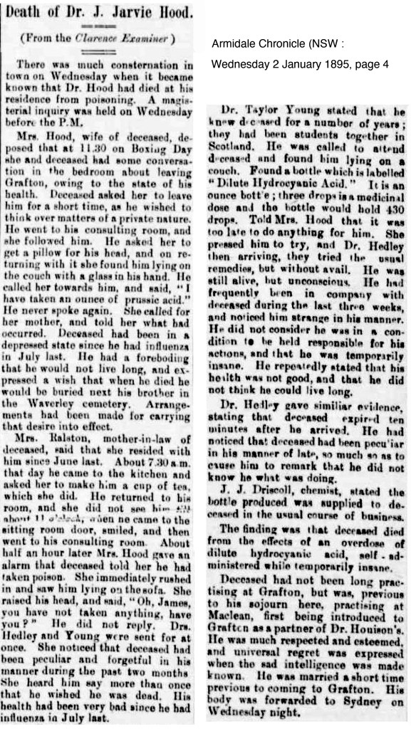 There was a final blow to Dr Houison’s medical practice in Grafton which was to come right at the end of 1894 with the death of Dr John Jarvie Hood on Boxing day, 26 Dec in equal shocking and sad circumstances.