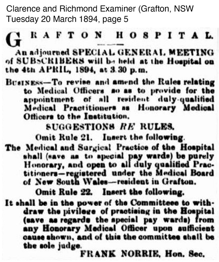 There had been a discussion through the year by the Grafton Hospital Board of whether the Medical Officers positions at the hospital should be a paid or honorary position.