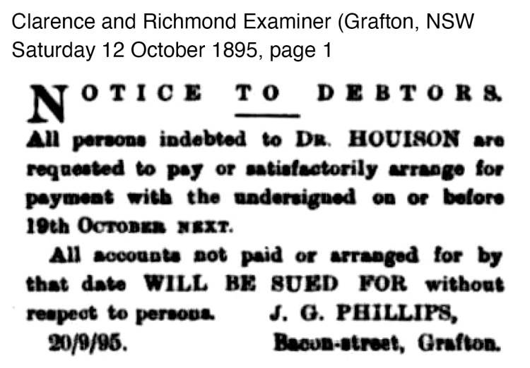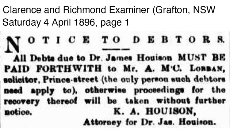 This indicates that the Houison’s are winding up all their affairs in the Grafton district. In Court in November a series of debtors are taken to court. These include ‘Herbert Eggins, 30s ; Dr. Houison v. same, £18 10s’.