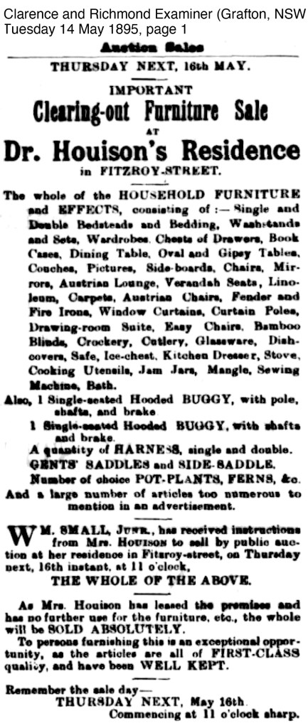 The news of a clearing out sale on 16 May 1895 appeared in a large advertisement. All of the Houison’s household furniture and effects were to be sold as Mrs Houison had leased the premises in Fitzroy Street, Grafton (now the Grafton Art Gallery). The auction was to be held by her brother William Small Jnr.