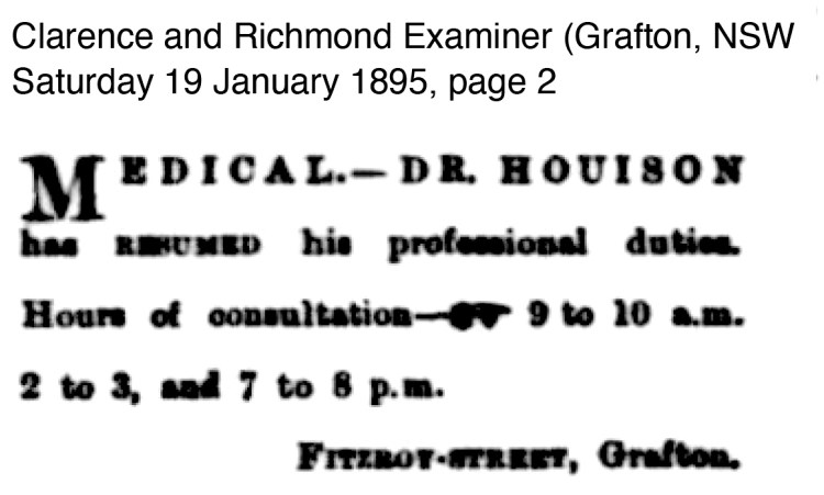 On 6 October 1894 the newspaper reported the return of Dr Houison; ‘We are pleased to hear that this gentleman (who has been under a course of treatment in a private hospital in Sydney, attended by Dr. A. Jarvie Hood) returned on Thursday last, thoroughly restored in health, and has resumed practice.’
