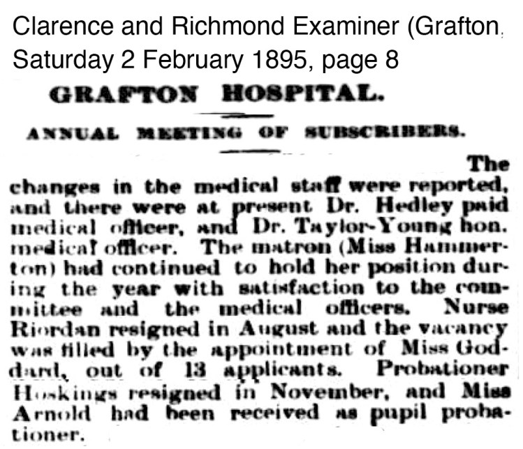 The Grafton Hospital Board received the resignation of Matron Miss Hammerton by the beginning of April 1895.