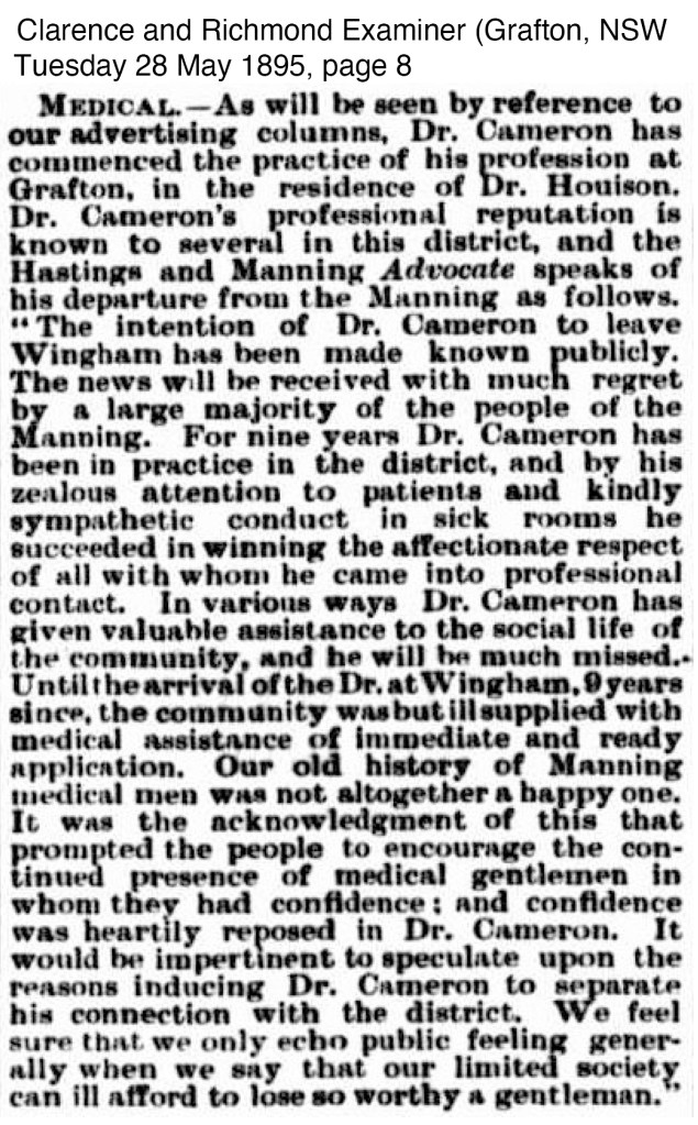 The 28 May brought the news that a new Dr Cameron was commencing working at the residence of Dr Houison.