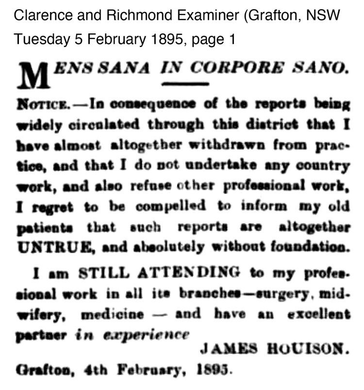 From April until October 1895, Dr Houison began taking leave of absence and resigning from his positions, including; Medical Officer at Grafton Gaol, Medical Officer and Vaccinator for the Grafton District, Grafton Benevolent Society and the Grafton Lighting Company Board. It is interesting from the following newspaper notices, that it is Kate Houison who appears to have taken charge of the financial matters in regards to Dr James Houison’s property and accounts. This is perhaps an important note given events in the future.