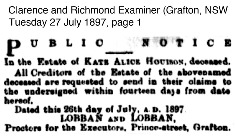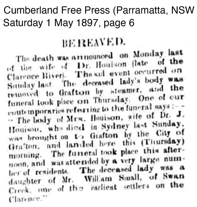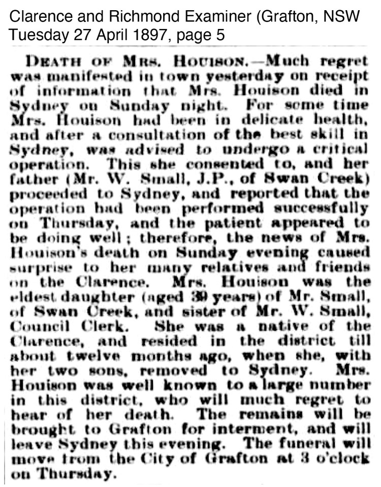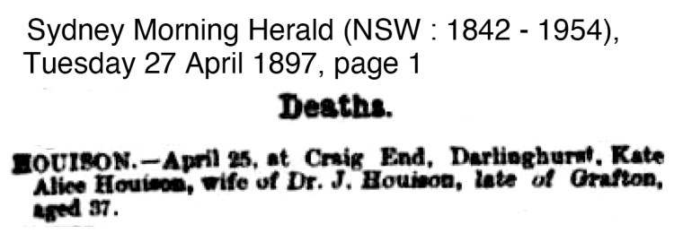 The next news for the Houison’s comes in the form of death, bereavement and funeral notices for Kate Alice Houison nee Small who died in Sydney after complications of surgery after a protracted illness on 25 April 1897.