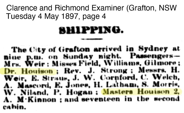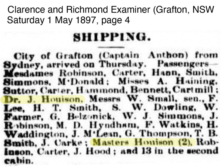 In January 1876, James father the architect, died in Parramatta and by March 1869, Dr James Houison announced his intention to set up practice in the Maitland area; ‘DR. HOUISON (of Parramatta for several years in practice at Grafton) INTENDS COMMENCING PRACTICE – in West Maitland, early next month.‘ 7 However by 14 October 1876, it is noted in the Grafton newspaper; ‘DR. HOUISON. – This gentleman arrived by the last trip of the Agnes Irving, and we, understand intends resuming the practice of his profession in Grafton.’ 8