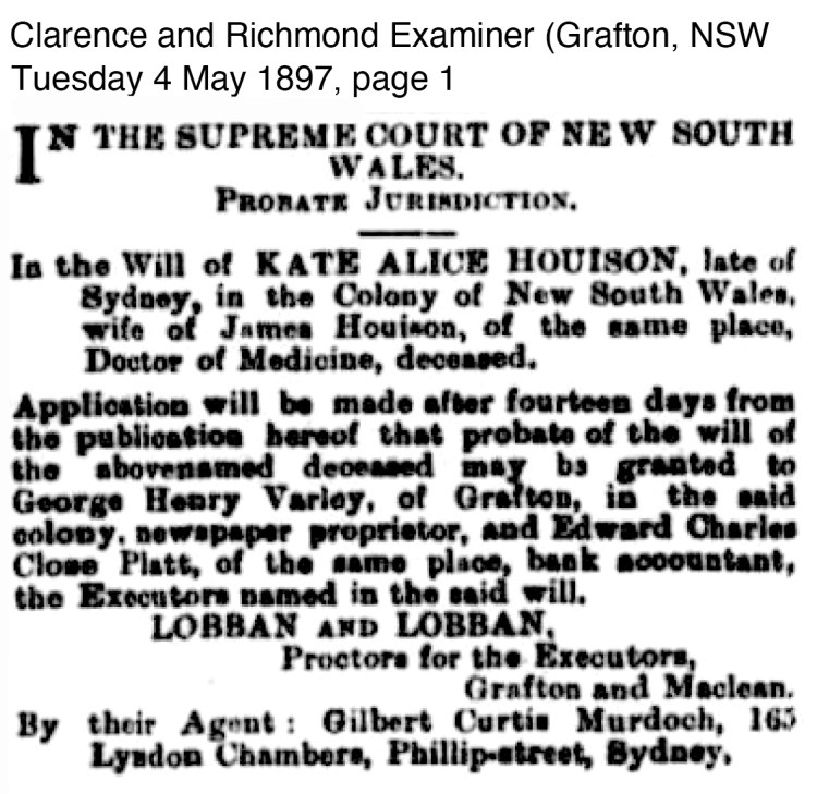 There are two notices in regards to the Estate of Kate Alice Houison in 1897 which gives some insight into what happens with the main portion of Allotment 10, Yamba purchased by Dr James Houison. The notices include the names of the Executors and Trustees of Kate Houison’s Estate who were George Henry Varley and Edward Charles Close Platt. It is obvious that both Kate and Dr James Houison trusted G H Varley and E C C Platt.