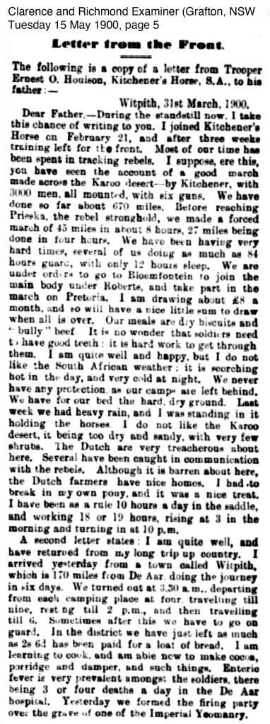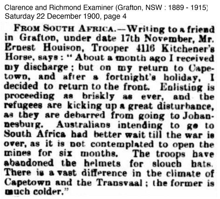 James and Kate Houison’s youngest son Ernest Oswald Houison fought in the Boer War, writing letters home published in newspapers.