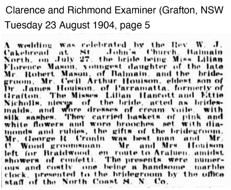 - Cecil Arthur b: 19 Dec 1880, Grafton d: 4 Jan 1965 Masonic Hospital Ashfield m: Elizabeth Eva Lamont 1912