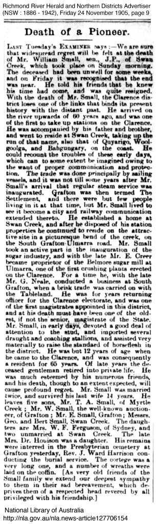Kate was the eldest daughter born on 29 Jul 1859 at Swan Creek, Ulmarra on the Clarence River. The Small family are some of the original pioneer families of the Clarence and William Small (even despite becoming bankrupt in later life) was held in high regard in the district.