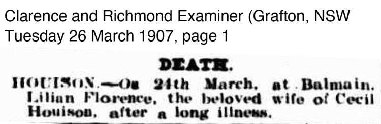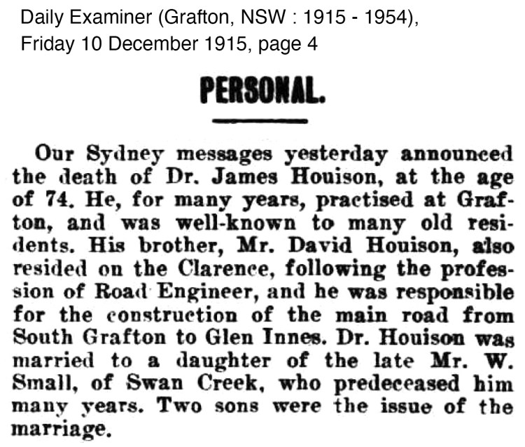 Dr James Houison never remarried and stayed in Sydney after the death of Kate. He died on 9 December 1915, with a small note in the Grafton Daily Examiner. The Cumberland Argus report notes he left before Kate died but it does not appear this was the case looking at the records.