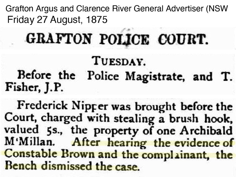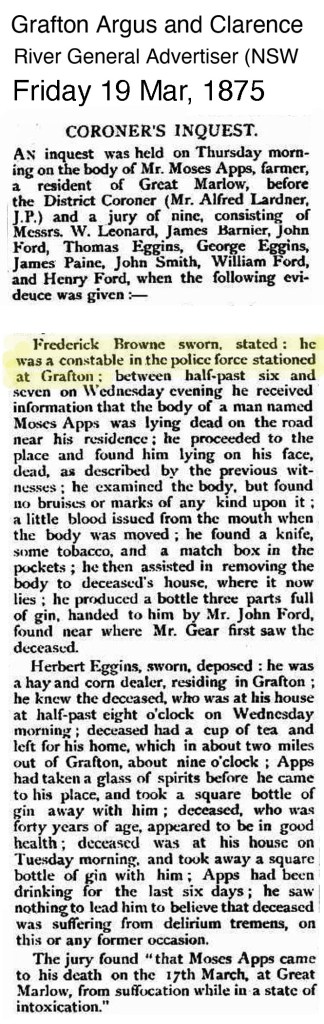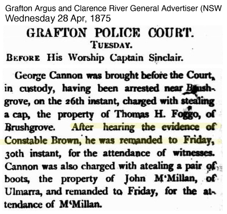 It appears Frederick Brown was working as a Police Constable in Grafton at that time. In 1875 there are reference for him in the local newspapers.