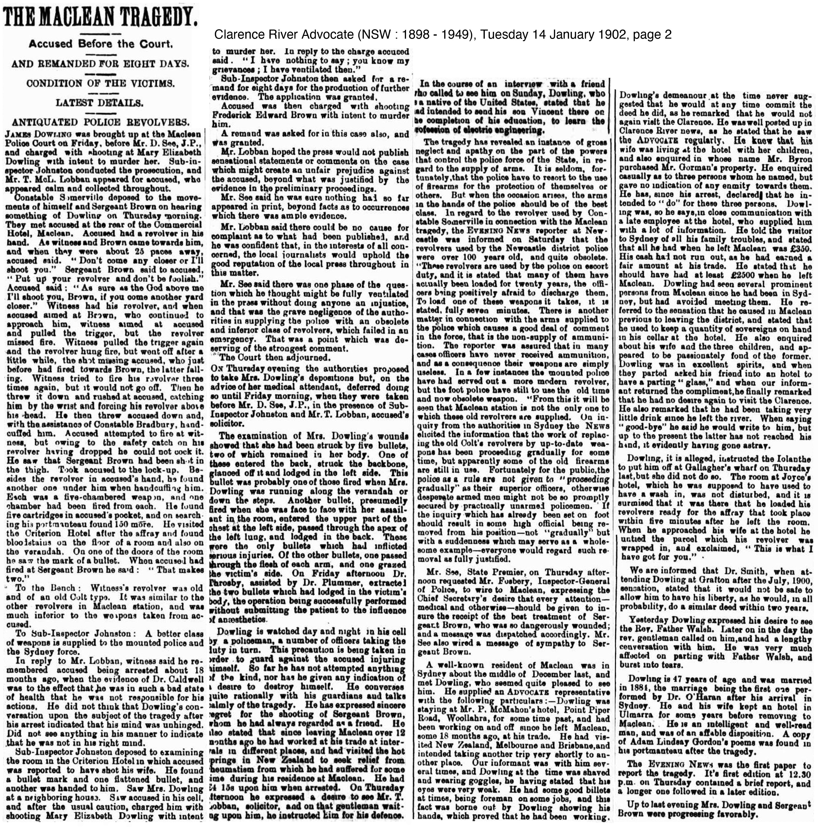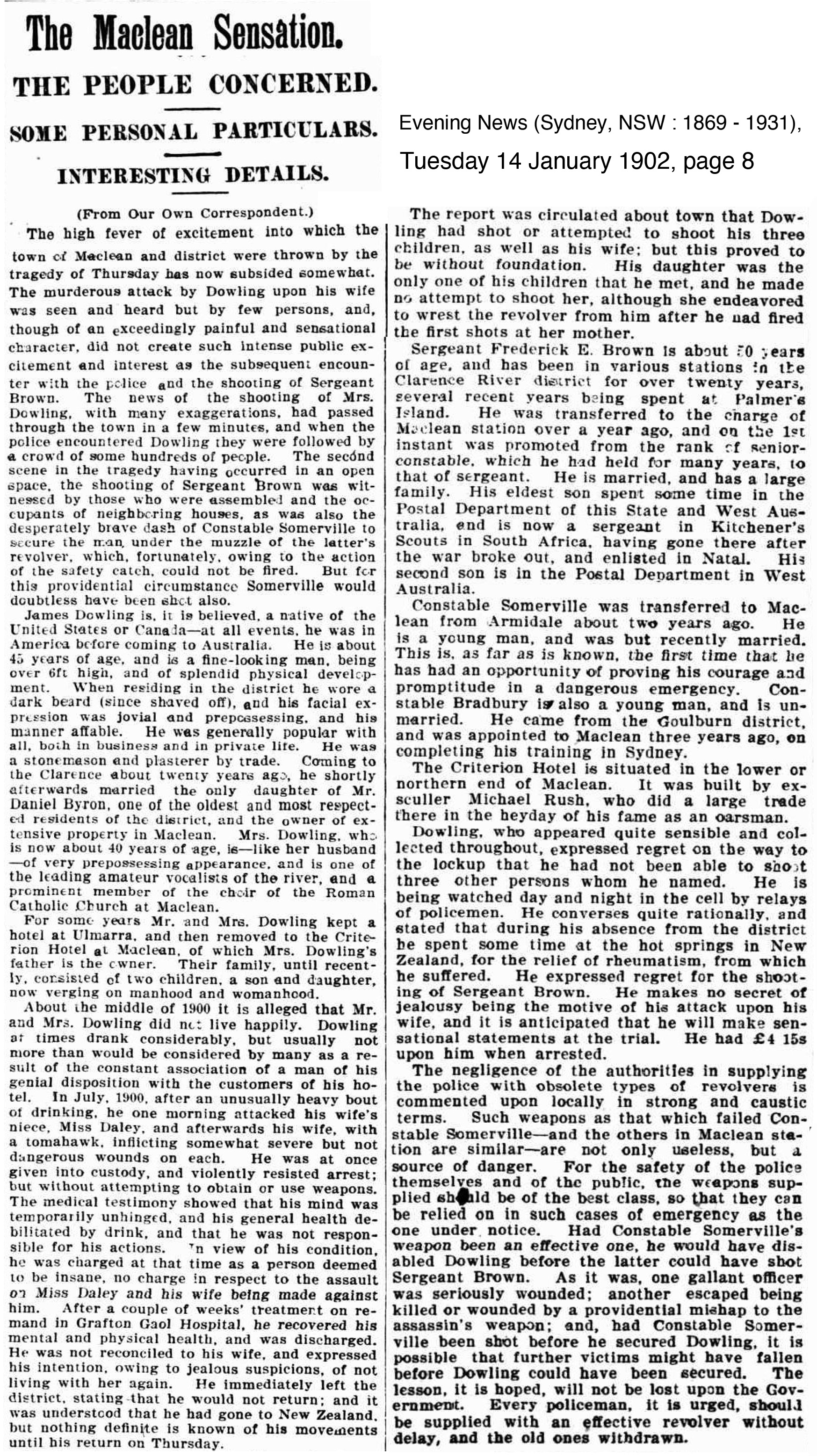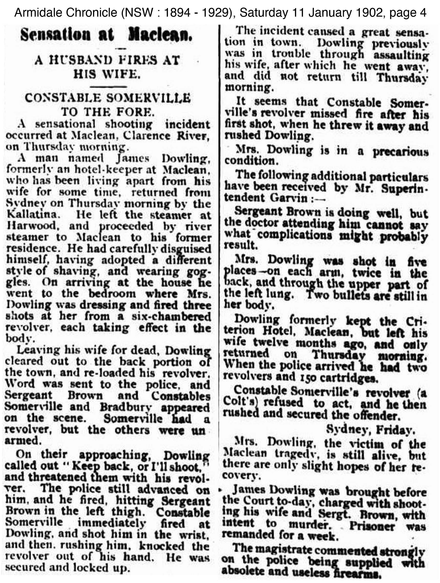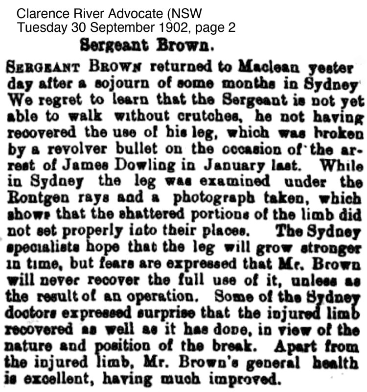 In 1902 Constable Fred Brown was shot in the line of duty but survived and continued as a Police Constable. Accounts of the crime, arrest where Fred was shot and the outcomes were widely reported on as it was quite a shocking case in many ways. James Dowling who had been removed to Sydney obviously unstable return by steamer, walked from the wharf up to the Hotel he had previously owned which was now being run by his wife, and shot her. He was chased and confronted by three policemen one of which was Fred Brown. He was warned but has he went to fire one of the Constable’s guns misfired when he tried to shoot Dowling to defend the Sergeant Brown and as a result he was shot in the leg.