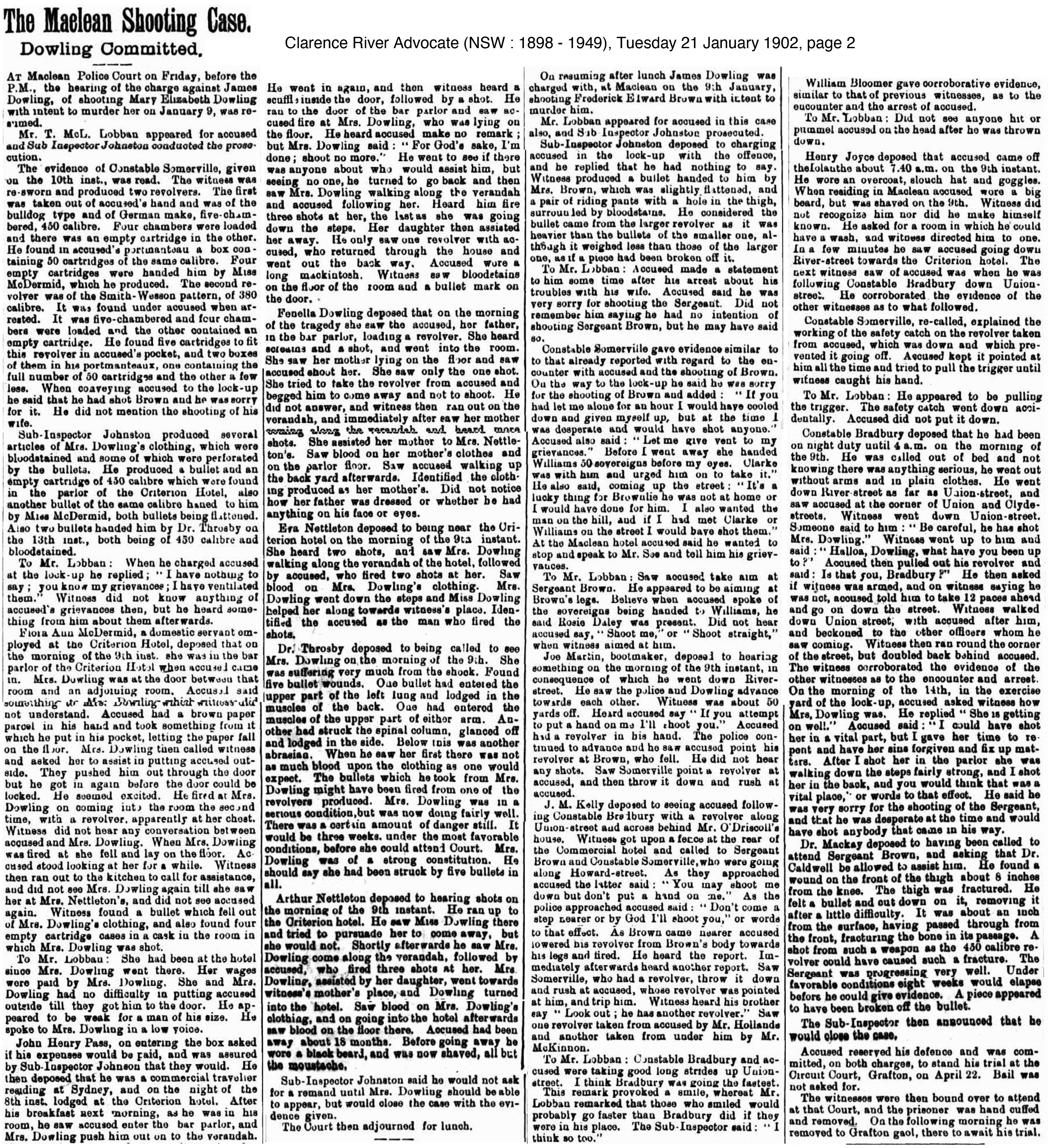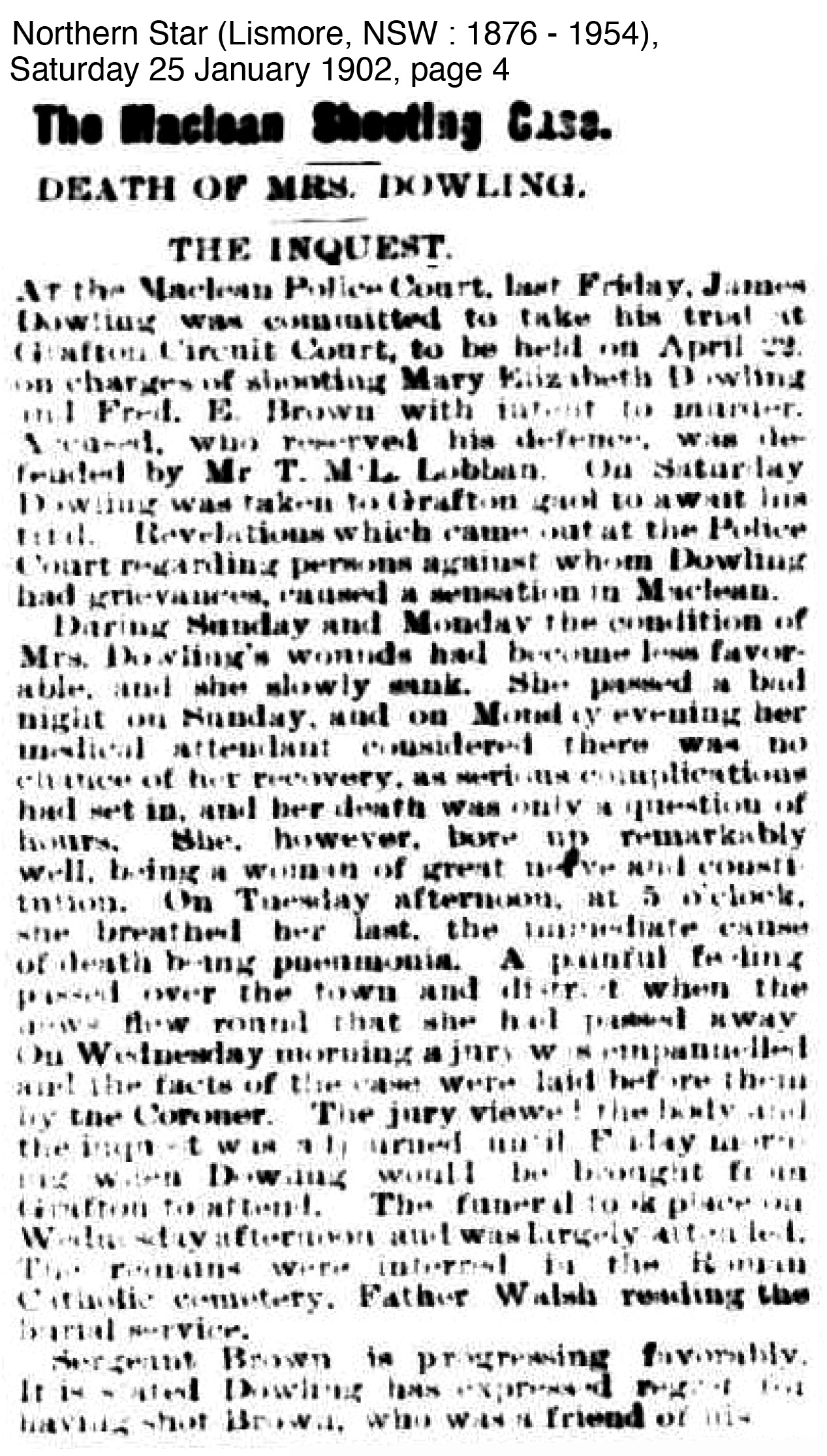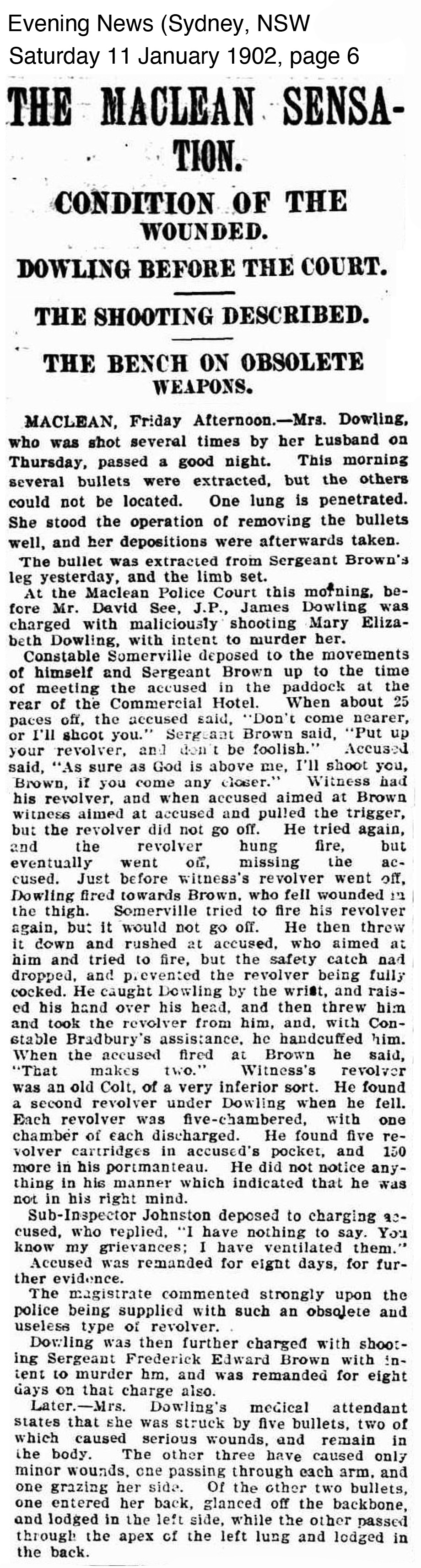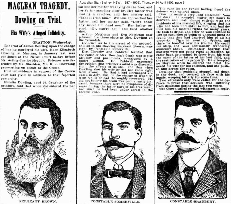James Dowling owned the Criterion Hotel in Maclean, had previously attacked his wife in 1900 and been deemed insane at that time but no charges were laid and he was released. In another link between owners of the cottage, the Criterion Hotel later became the Royal Hotel and was owned by John Murphy who in 1927 purchased the cottage at 3 River Street, Yamba.