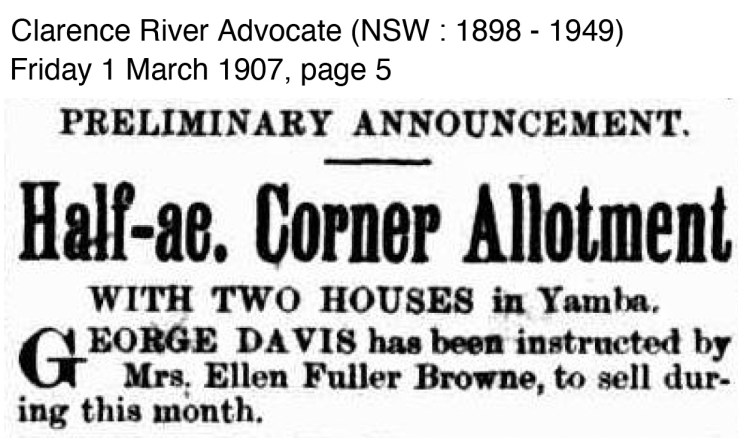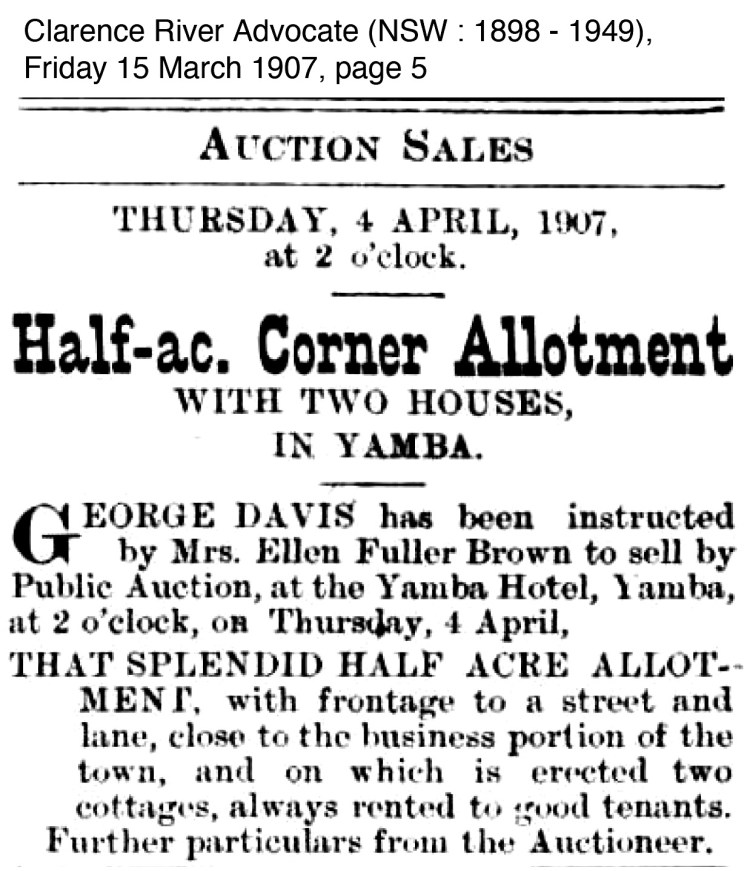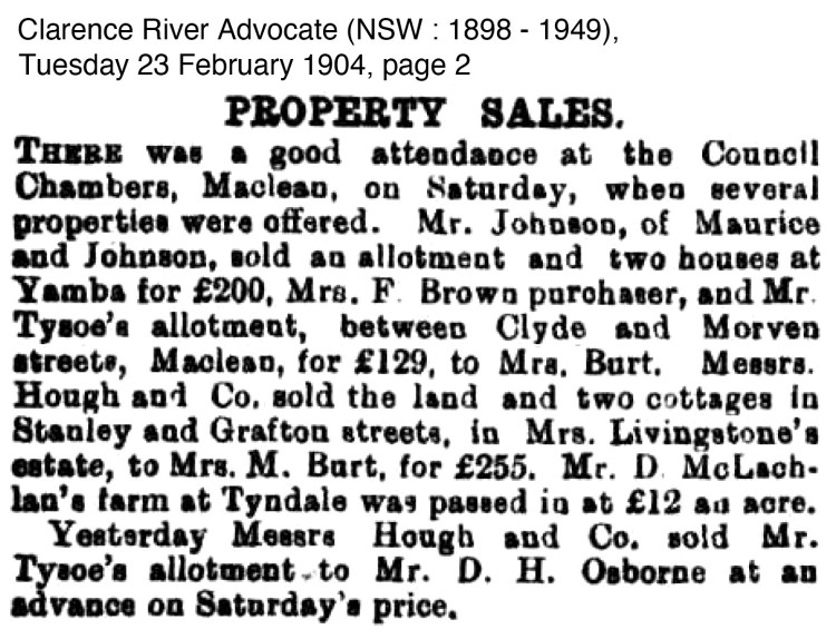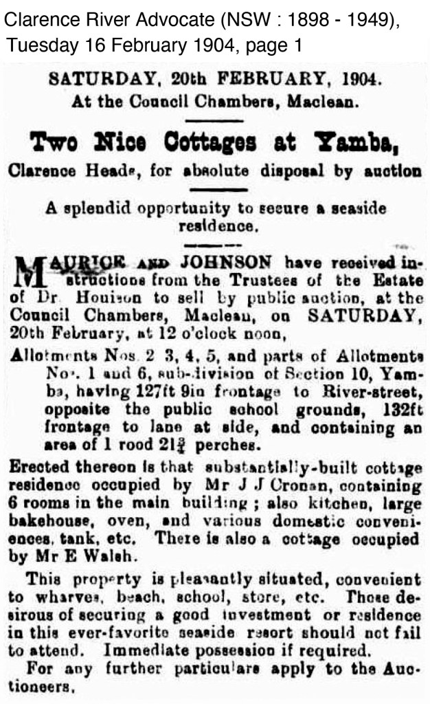 In February 1904, ‘Two Nice Cottages at Yamba’ were advertised for sale on Saturday 20th February at the Council Chamber, Maclean.