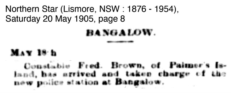 However, within a year the Brown’s moved from the area when Fred Brown was transferred further north to take charge of Bangalow Police Station.