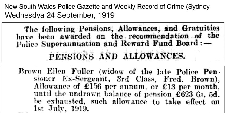 Ellen Fuller Brown received a Pension from the Police Superannuation and Reward Fund in September 1919.
