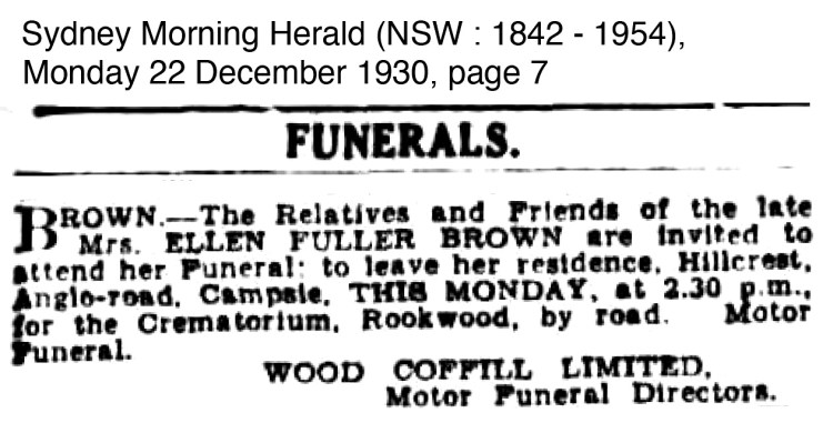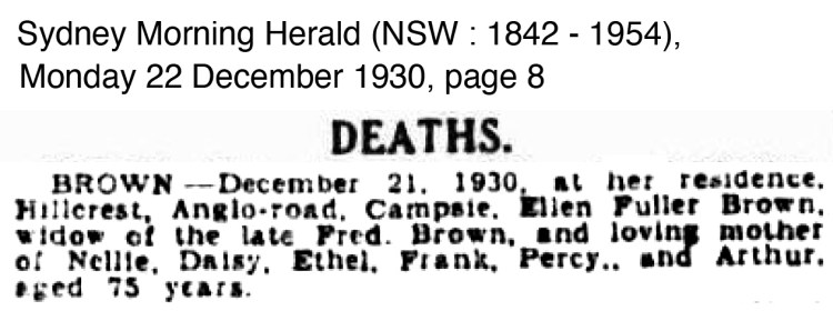 Ellen fuller Brown nee Ward died on 21 Dec 1930 at her residence in Campsie, Sydney. Fred and her children are recorded as: Nellie, Daisy, Ethel, Frank, Percy and Arthur. She was 75yrs of age.