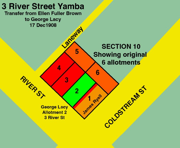 On Saturday 12th December, 1908 George Lacey again placed his thirteen properties on the market ; ‘As Mr Lacy has definitely decided to leave the district at an early date, we are instructed to sell the whole of the above valuable properties at the present market rates, believing that the public are fully seized with the growing importance of South Grafton, now that the advent of the North Coast Railway is an accomplished fact. It should be patent to far-seeing speculators, and persons in search of comfortable homes, that this is an opportunity that may not occur again in a lifetime. One word more: It will pay intending purchasers to inspect these desirable properties, and obtain full particulars from the Auctioneers before the day of sale.’ It would appear by the number of properties and the advertisement that George Lacey was speculating in the property market. This is also perhaps evident by the fact that the certificate of transfer from Ellen Fuller Brown to George Lacey for the property now known as 3 River Street was transferred on 10 June 1908 with the title being produced and entered on 4 December 1908 and it was included in the sale notice as Lot 13 as part of the sale of all his properties.