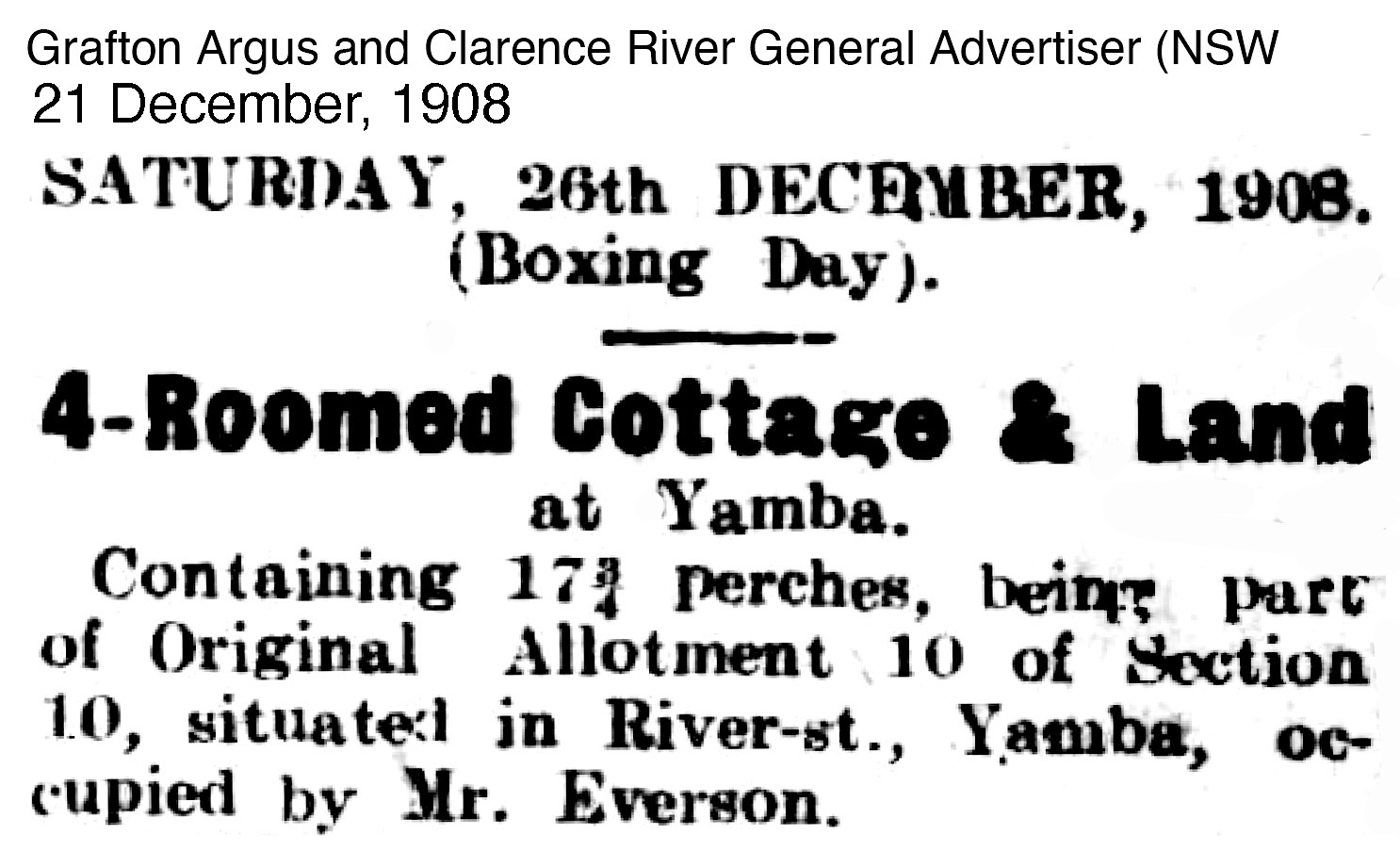 ‘Lot 13 – Containing 17 ¾ perches, being part of original allotment 10 of section 10, having a frontage to River-street, Yamba. On this allotment is erected a four-roomed Cottage and Kitchen, occupied by Mr Everson.’