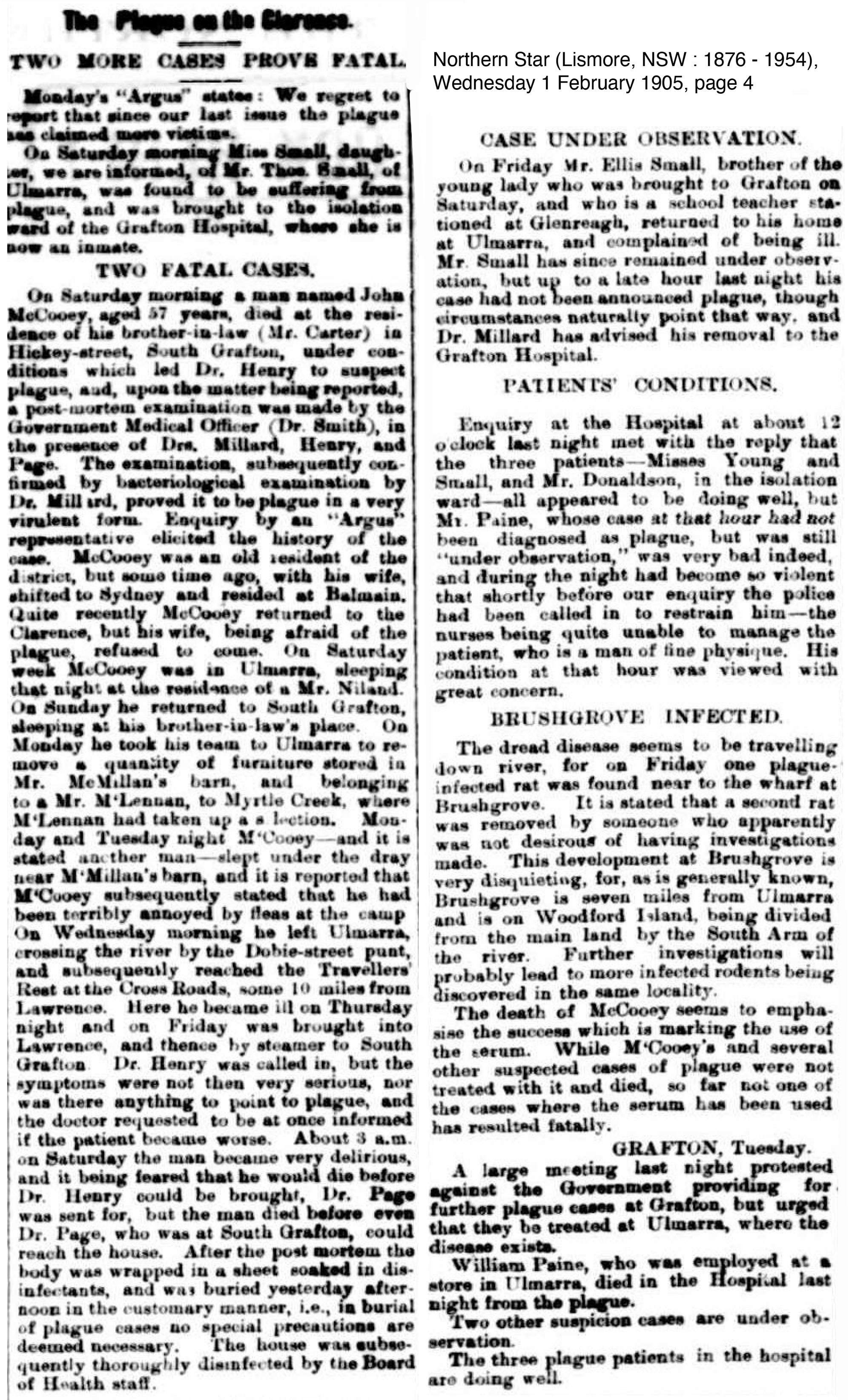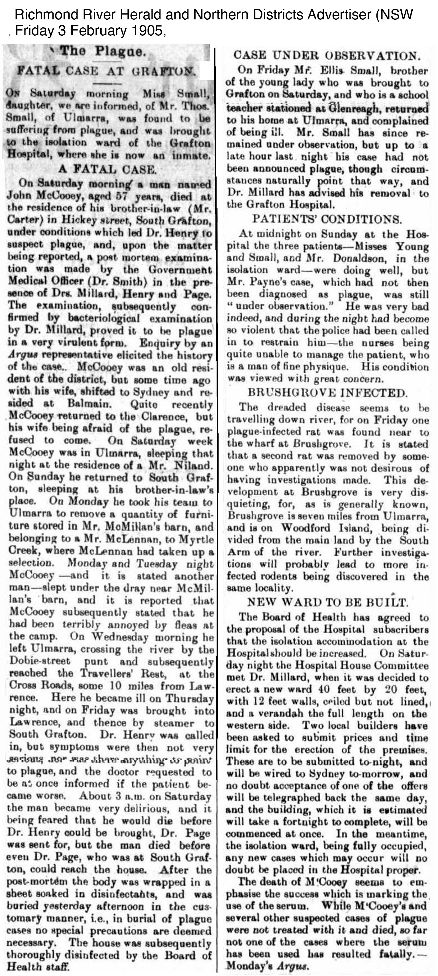 In February 1905 John McCooey who was working as Carter with a bullock team, the following is an account presented at his inquest: ‘McCooey and his mate, Carter [a brother in law], were conveying some furniture for D. McLennan to Myrtle Creek, and prior to leaving Ulmarra both men slept under the waggon. The first night they could obtain but little rest by reason of the fleas, and on the second night could not sleep at all. On reaching a point on the Casino road 10 miles from Lawrence, McCooey was taken seriously ill, and Carter sent word to Senior-Constable Selff, who went out at 2 a.m. on Friday, McCooey was then so weak that he could not sit up in a vehicle, and it was believed by those in his company that he had plague, as he came from a plague infected area. He was conveyed to Lawrence, thence to South Grafton, and was attended by Dr. Henry, who could not, on the symptoms then present-ing themselves, be satisfied, that the case was plague. He intended to again visit McCooey, who, however, succumbed before the doctor again visited him. Dr. Smith, who was present at the post mortem, described the condition of the body internally, and said that Dr. Millard pronounced it a true case of plague. The Coroner found that death was due to plague.’1