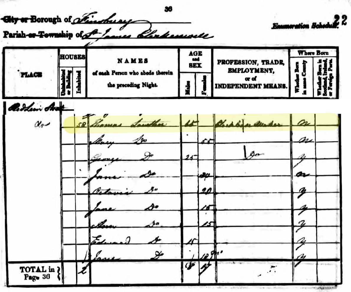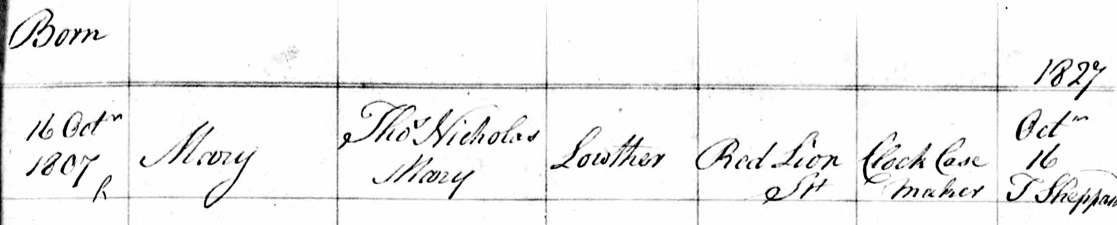 The key to finding the Lowther sisters is within the name ‘Octavia’, unusual enough amongst the other names, along with the surname, to give a breadcrumb to follow. When looking for clues it is always good to find an unusual name, list of names, town, or circumstances that provide a link. In going back through the records there is the family of Thomas Nicholas Lowther, a clock case maker and Mary Lowther nee Bedford who lived in Clerkenwell in London, England.
