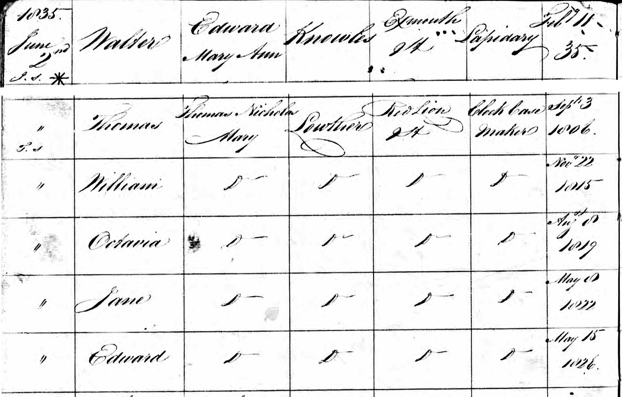 - Thomas b: 3 Sep 1806 – Clock Case Maker m: Mary Ann Browning (died) and Augusta Cowley d: unknown