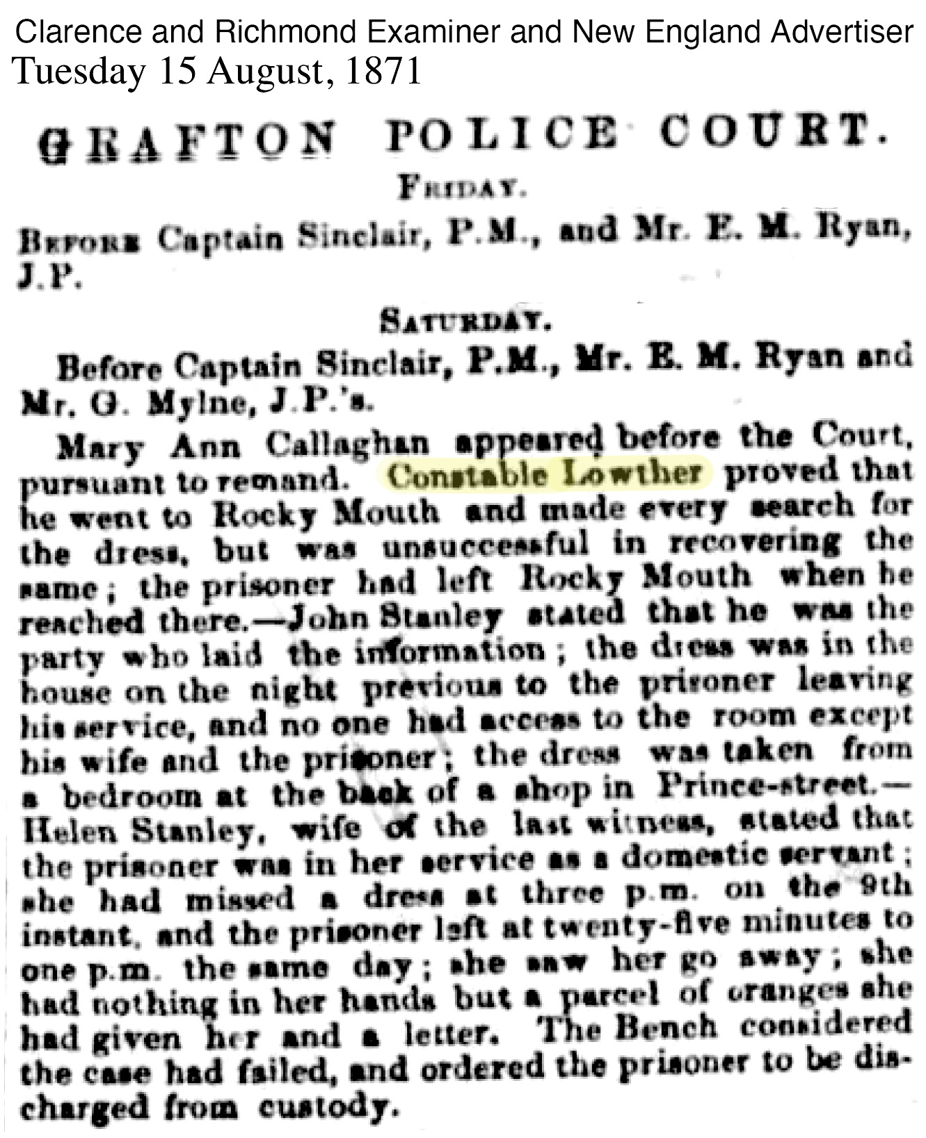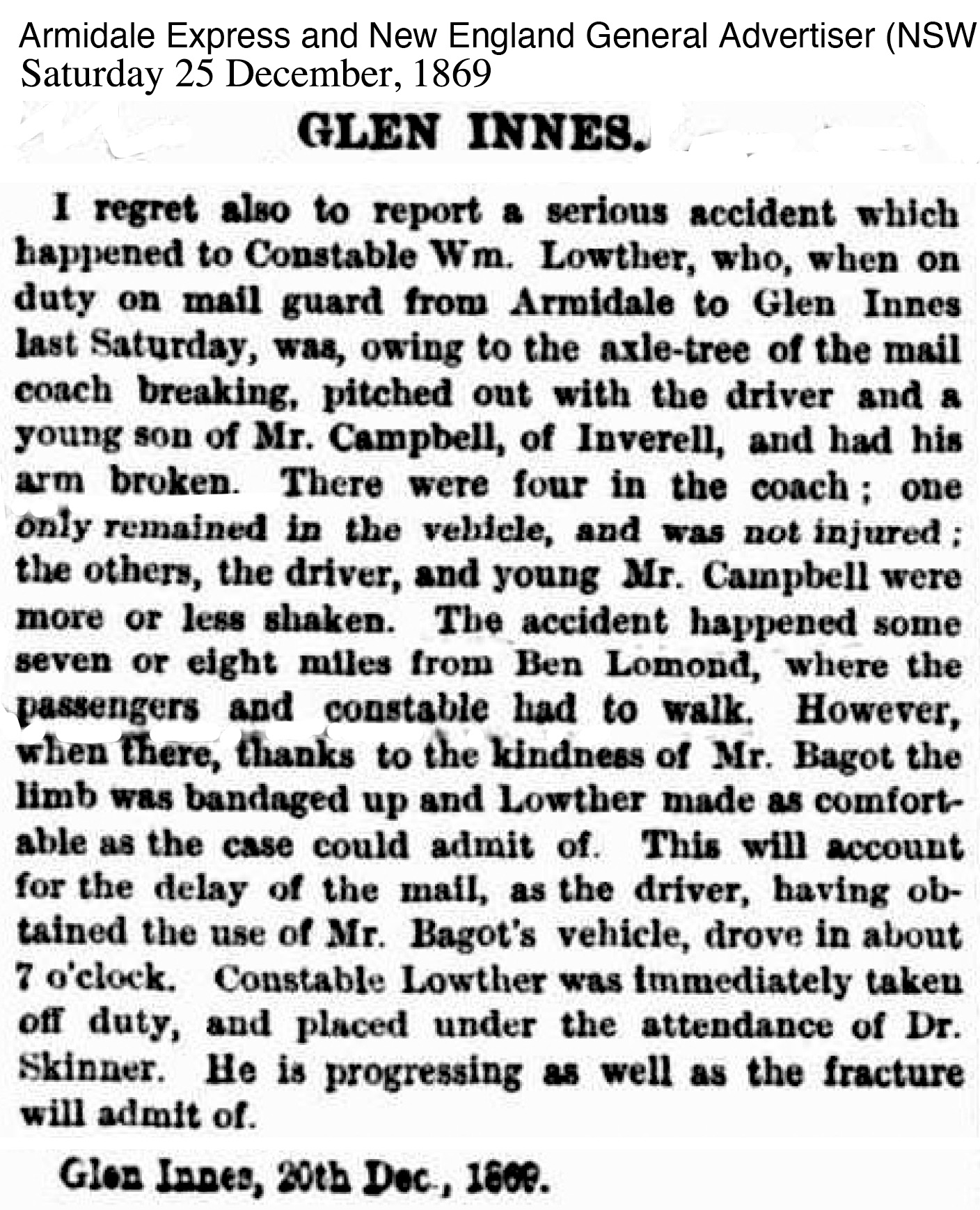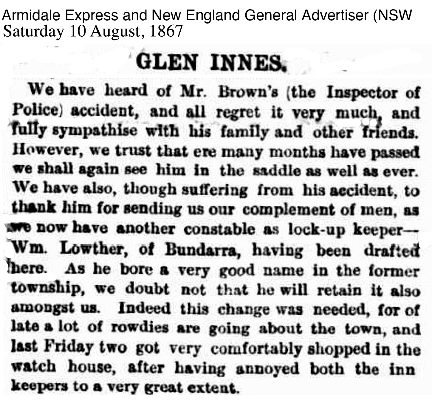 There are several immigrants listed as ‘Lowther’ but no given name, he could have been one of these. The first record that can be found for William Lowther in Australia is when he joined the Police force in 1862, he would have been 47 years of age. He was appointed to work in Bundarra, Glen Innes, and Grafton and several newspaper articles can be found about his work as a Police Constable, some of which are below.