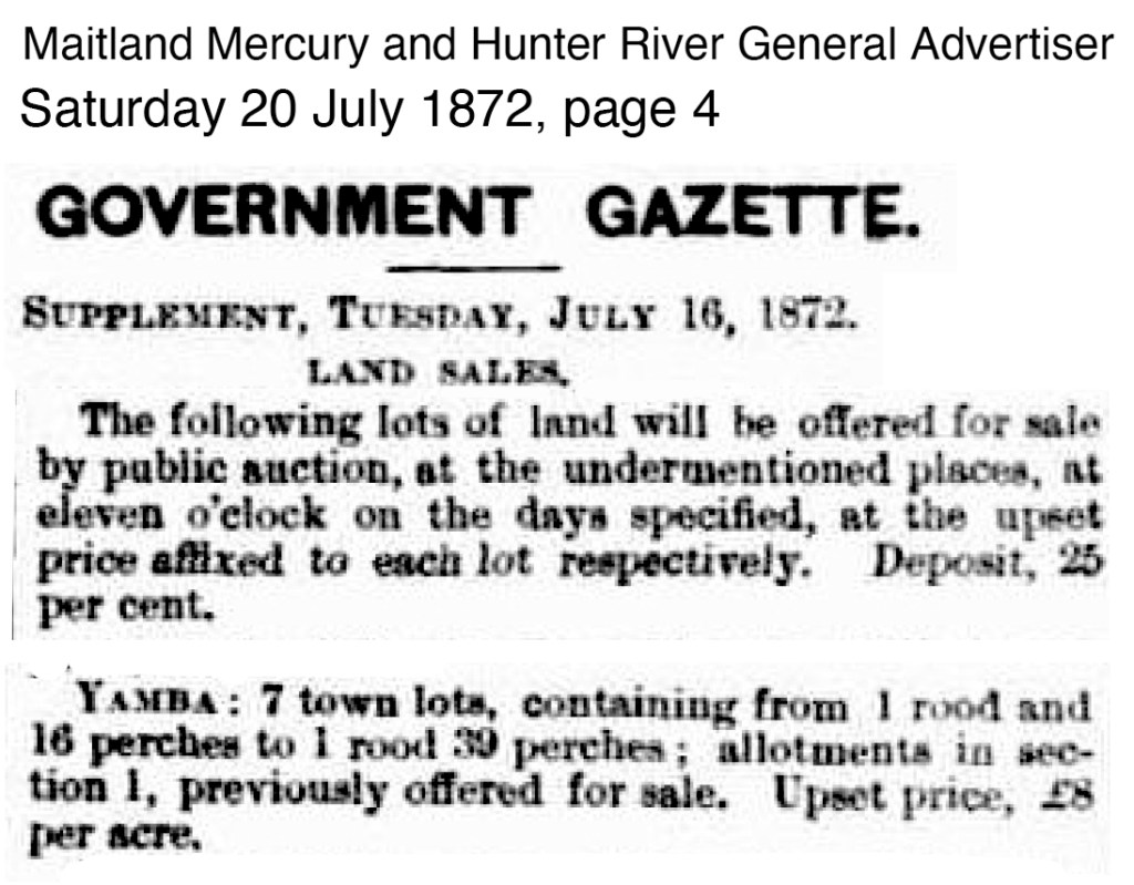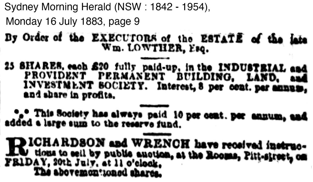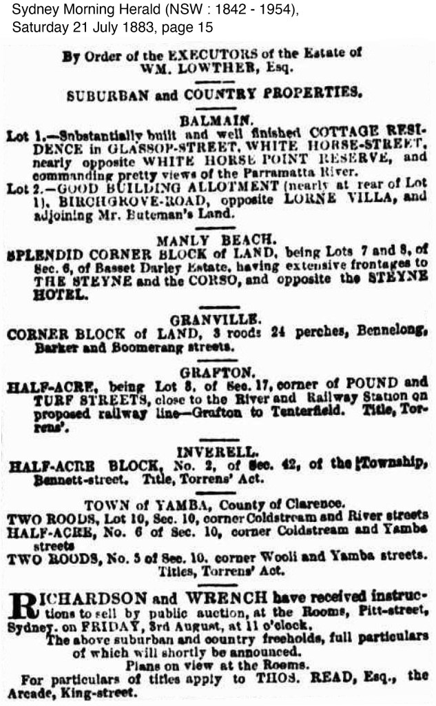 Within the Probate records and the records for the sale of his property for his Estate we find that William Lowther was probably quite an astute man who made good business and financial decisions. His Estate’s value in property and assets reported by the Solicitor and Executor, Thomas Read reported that he had £4000 to distribute. Below is the record of the administration of his Estate by Thomas Read, an advertisement for the sale of shares to the value of £500 and a series of suburban and country properties, many in prime positions and included the three allotments in Yamba.