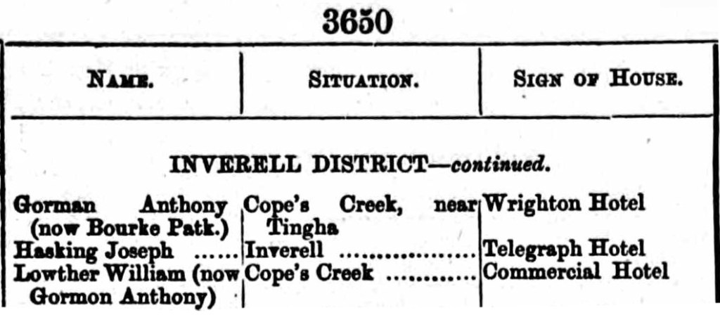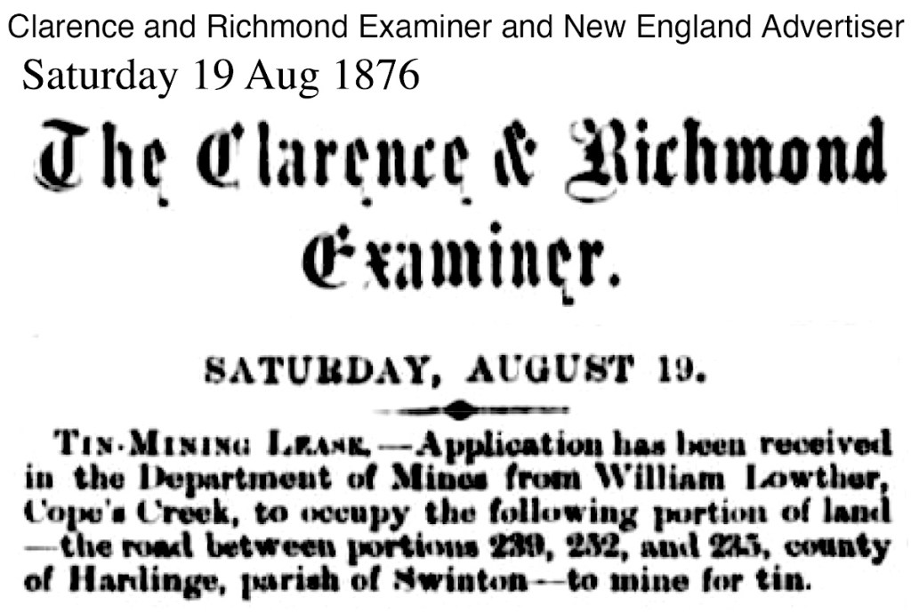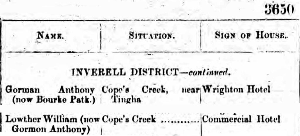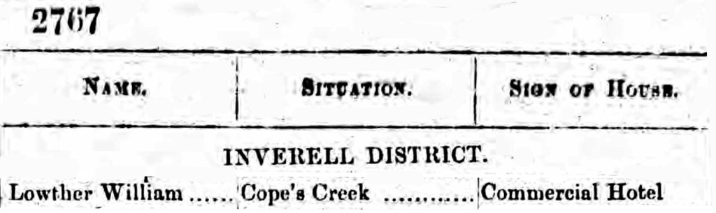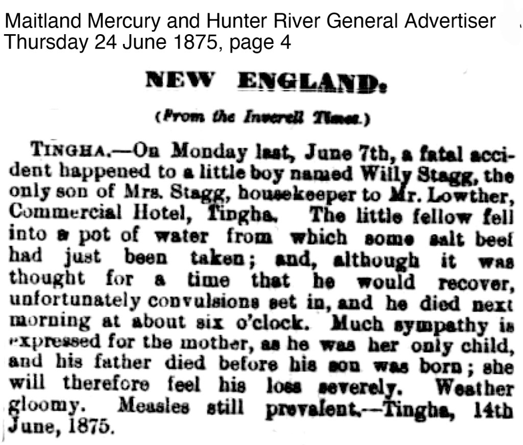 After he left the Police force, William is next found in Tingha, just outside Inverell, where he took up a license at the Commercial Hotel, Cope’s Creek, Tingha. He also had a tin mine close by. In June 1875 an incident happened at the Hotel where the son of his housekeeper was killed after being badly scalded. She was a widower and her name was Mrs Stagg and her son, was Willy Stagg.