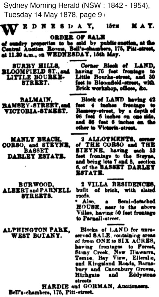 The Basset Darley Estate at Manly Cove came up for sale from 1877. Section 6 Lots 7 & 8 was auctioned on 15 May 1878. It was prime property right opposite the Steyne Hotel, the beach and fronting both The Corso and Steyne Roads. In 2021 it is now the site of a ‘Starbucks’.