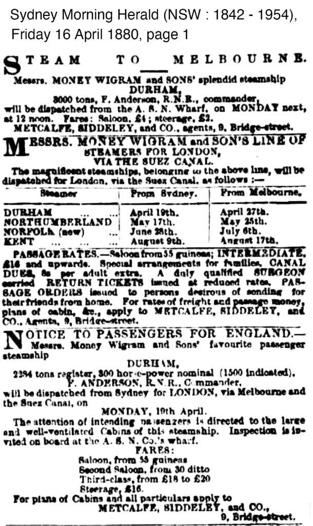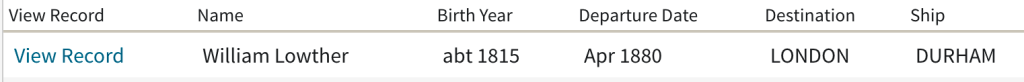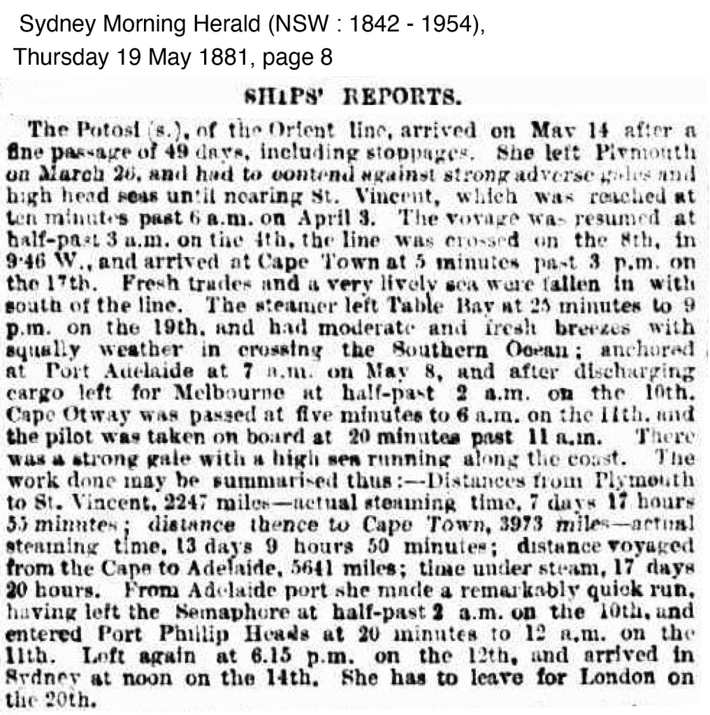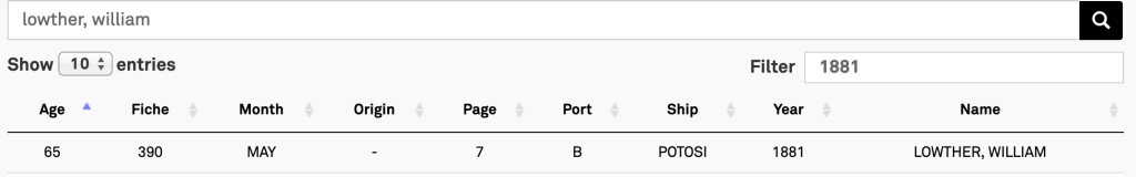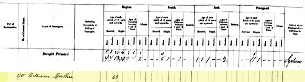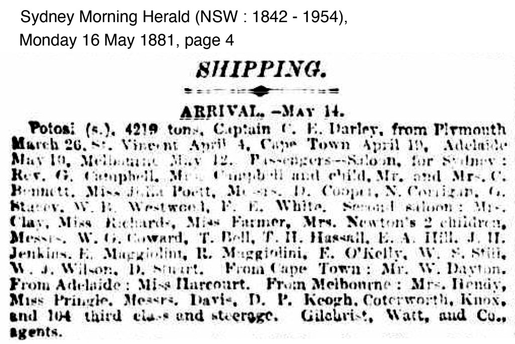 William Lowther did not remain in Inverell. There are some shipping records for 1880 and 1881 indicating that a William Lowther aged 65 years went to London on the ship ‘Durham’ leaving Sydney on 19 April. Returning to Sydney on the ‘Potosi’ on 11 May 1881 he was recorded as William Lowther aged 65 years born abt 1816. His Will was recorded in Sydney on 15 April 1880 so it is possible that he went back to England to finalise his affairs.