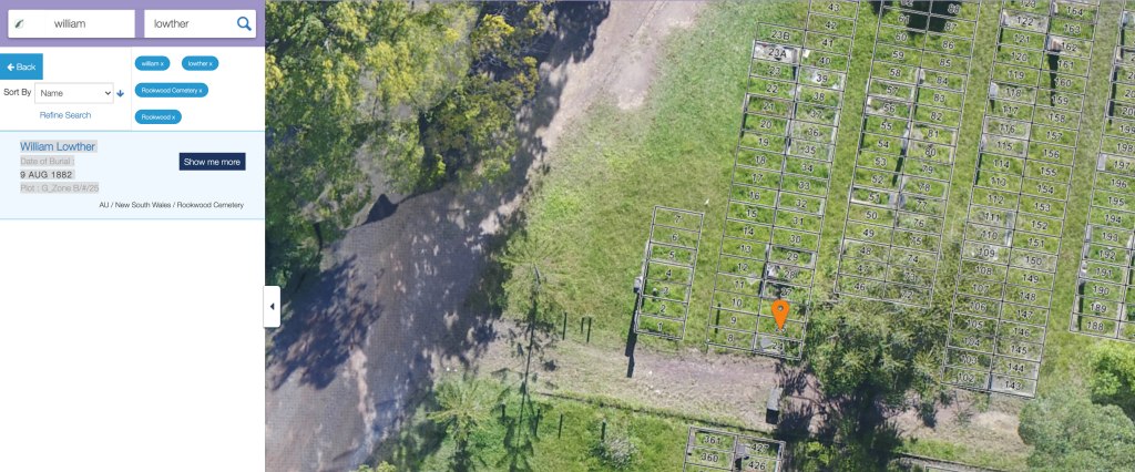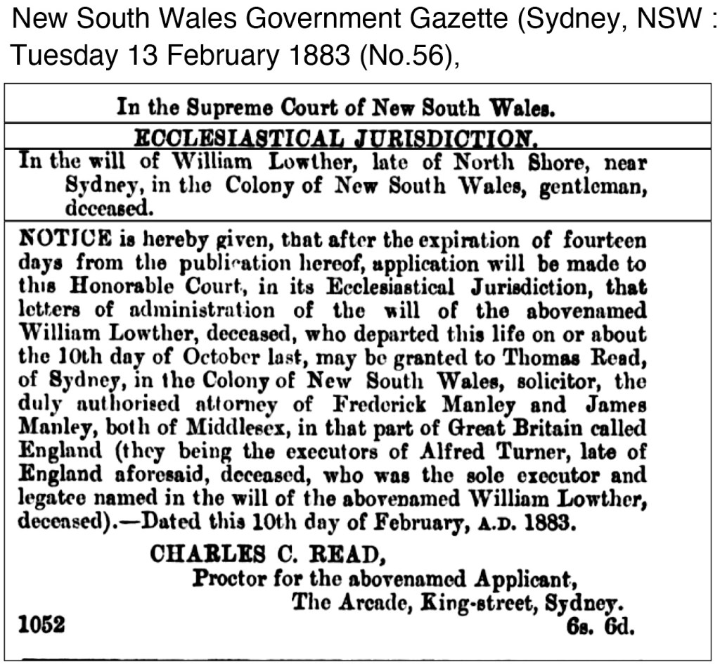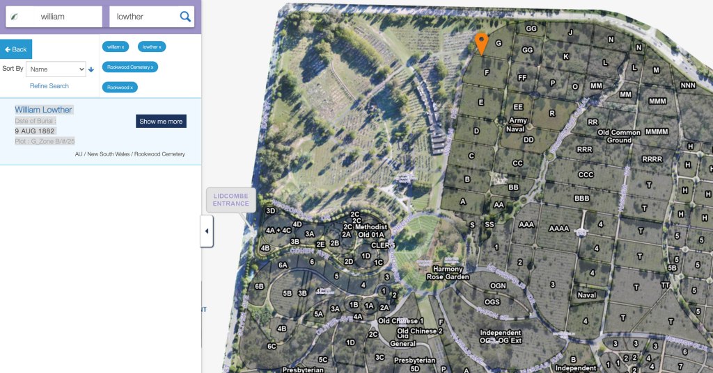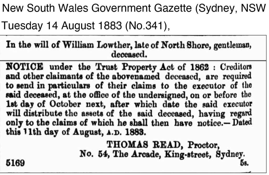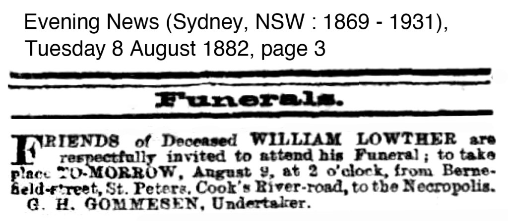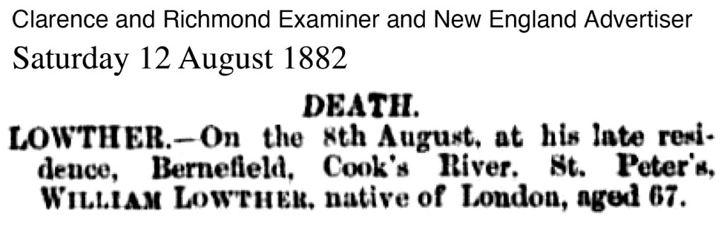 In 1882 William Lowther, Gentleman, passed away in Petersham, Sydney, and is buried in Rookwood Cemetery, Sydney.