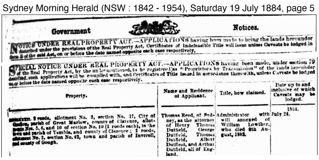 William Lowther’s Will declares that he leaves his Estate to ‘Albert Tucker of 3 St James’ Road Victoria Park London‘ who was also to be his sole Executor and Legatee unless he pre-deceases him then it is to go to his five sisters. However the Crown Grant in Yamba was transferred in an ‘Application by transmission No. 2182‘ with a Certificate of Title transferred to five ‘Dutfield’ brothers; Henry Thomas, George, Thomas, Albert, and Arthur. The brothers were all living in England, many of them working as their father did, as ‘carmen’. Carmen were employed as delivery drivers or couriers, it is interesting that in the 1861 Census, the Dutfield’s business was being run by Catherine E Dutfield (widow), they had their own car yard in Whitechapel and employed up to 21 labourers. There appears to be no obvious connection between William Lowther and the Dutfield brothers. Contact with a descendent had no knowledge of any connection to either William Lowther, Australia, or their inheritance, but the five Dutfield brothers did inherit his Estate.