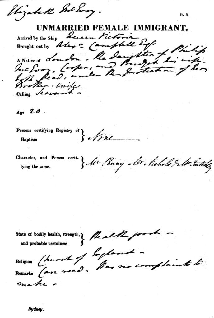 Elizabeth McEvoy’s arrival record on the ‘Queen Victoria’ on 26 July 1841 gives some information about her and her family.