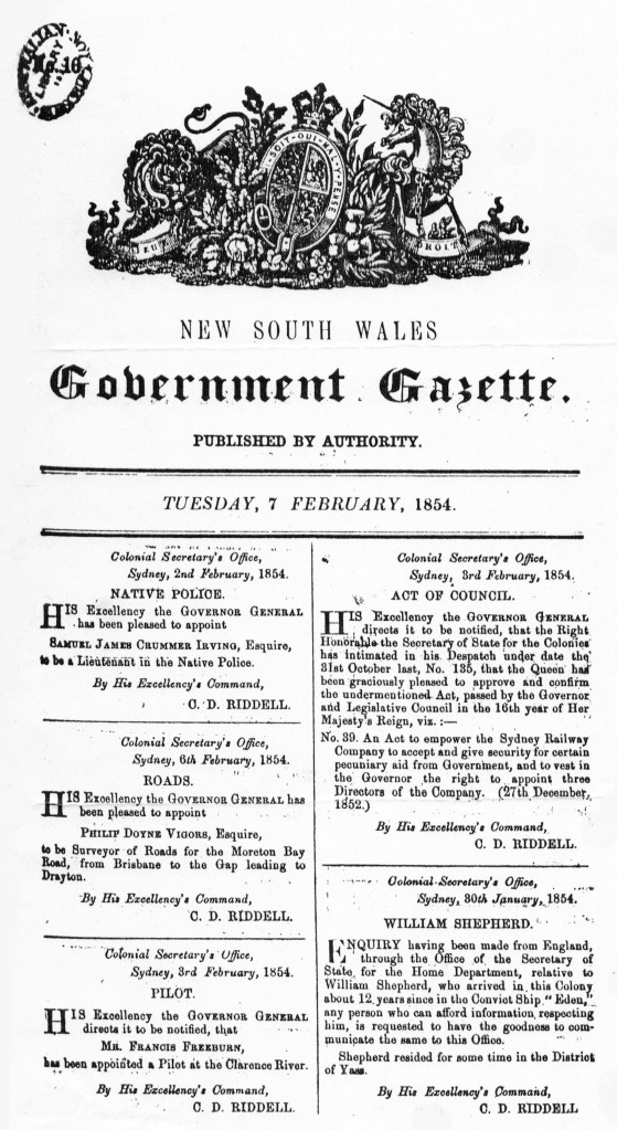 The family story was that Fred ‘jumped ship’ which an advertisement in the NSW Government Gazette shows is correct. Note the variety of spelling of his names which continued throughout his life. He was however not charged and it seems likely he returned to the ship.