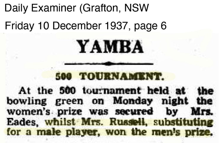 Annie May also was part of the Ladies Hospital Auxiliary Committee participating in their fundraising for the Lower Clarence Hospital. Both May and Herb Russell helped out at Surf Life Saving functions, School of Arts functions, dances, Yamba Public School functions and many community activities within the township of Yamba from their return to Yamba in 1930. May Russell was also a keen card player participating and winning various Euchre, 500 and card Tourney’s.