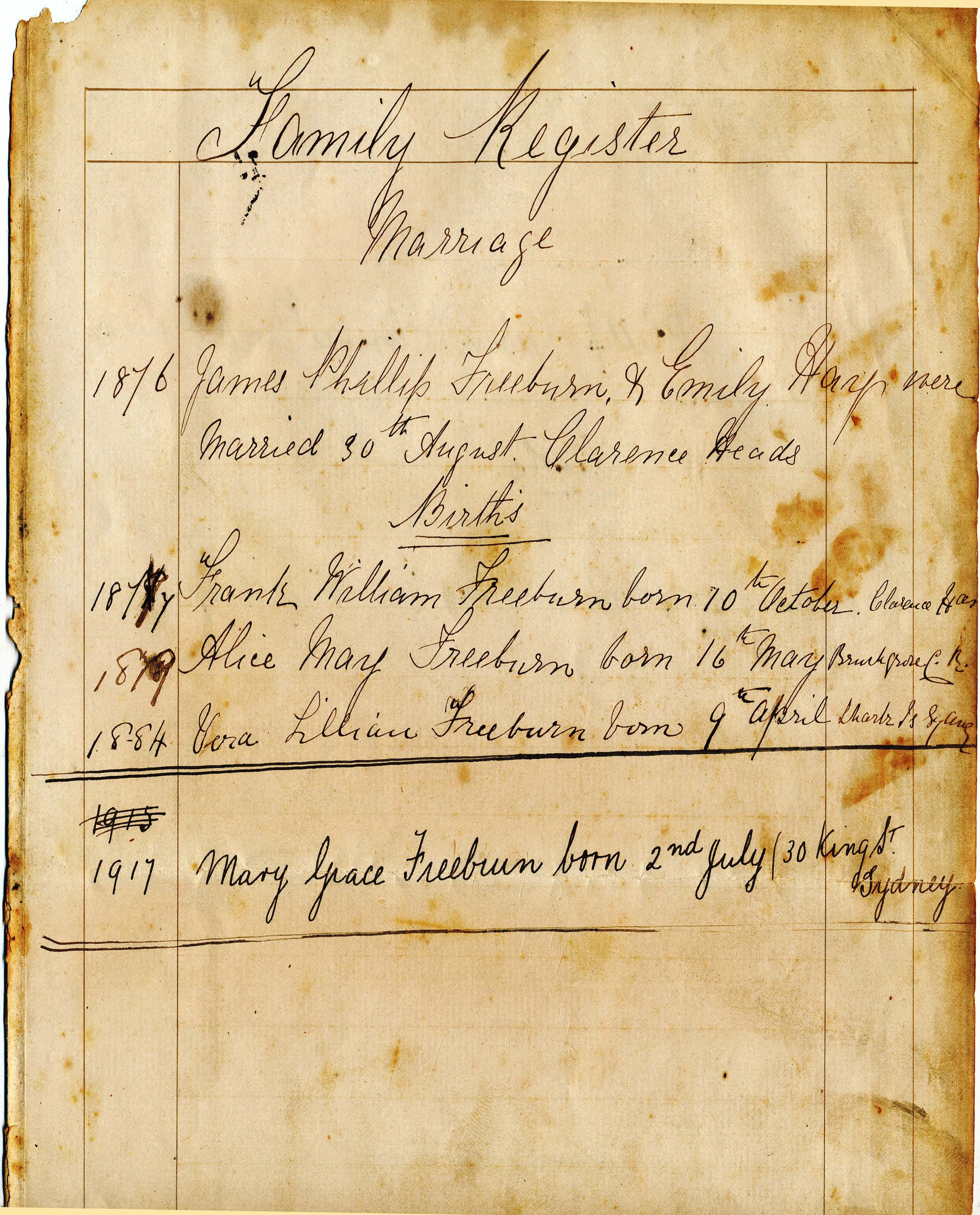Francis Freeburn and Elizabeth McEvoy had 5 children between 1847 and 1855 in Sydney, sadly three of their daughters died before the family settled in Yamba: