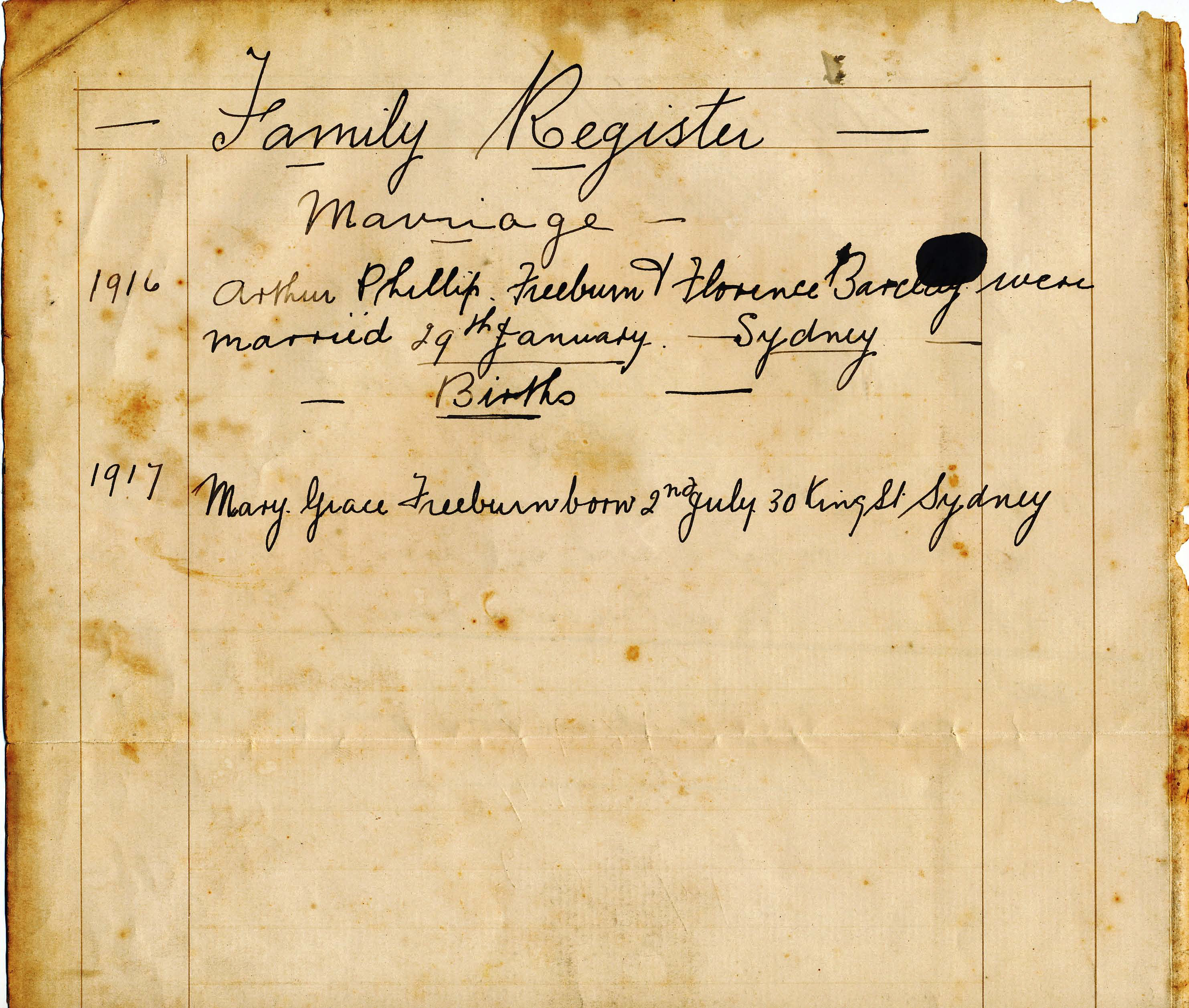 - NSW Births Deaths and Marriages – MARRIAGE Freeburn & McEvoy Ref:16/1842 V184216 26C