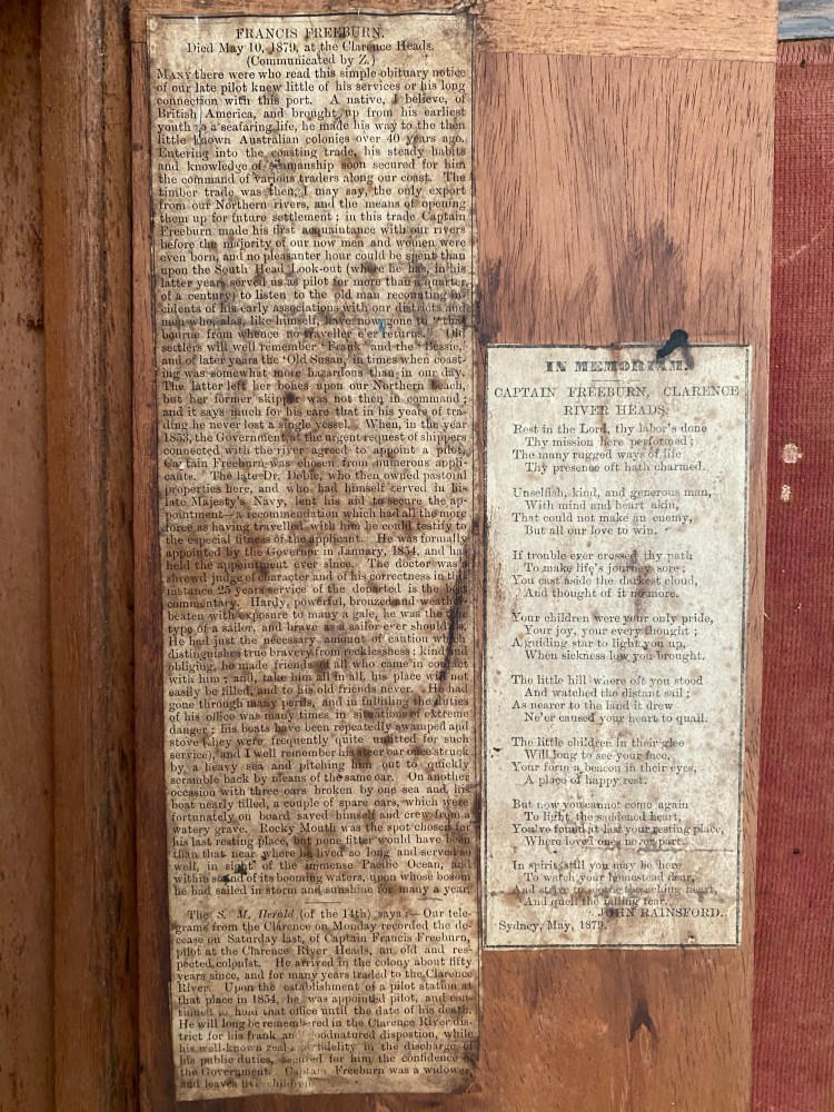 Francis Freeburn was a Canadian Master Mariner, a Ship’s Captain, who was born in St John’s New Brunswick, Canada it is believed in 1812. His death certificate states he was 67 years of age in 1879.1 He travelled to the colony of New South Wales in 1840 . He worked as a Captain in the Coastal Trade and first came to the Clarence River on the ‘Bessie’ on behalf of his employer Dr Dobie, as part of the early trade. He next came on the ‘Susan’ bringing early pioneer Thomas Small and his family who settled on South Arm on Woodford Island which was originally known as ‘Small’s Island’.