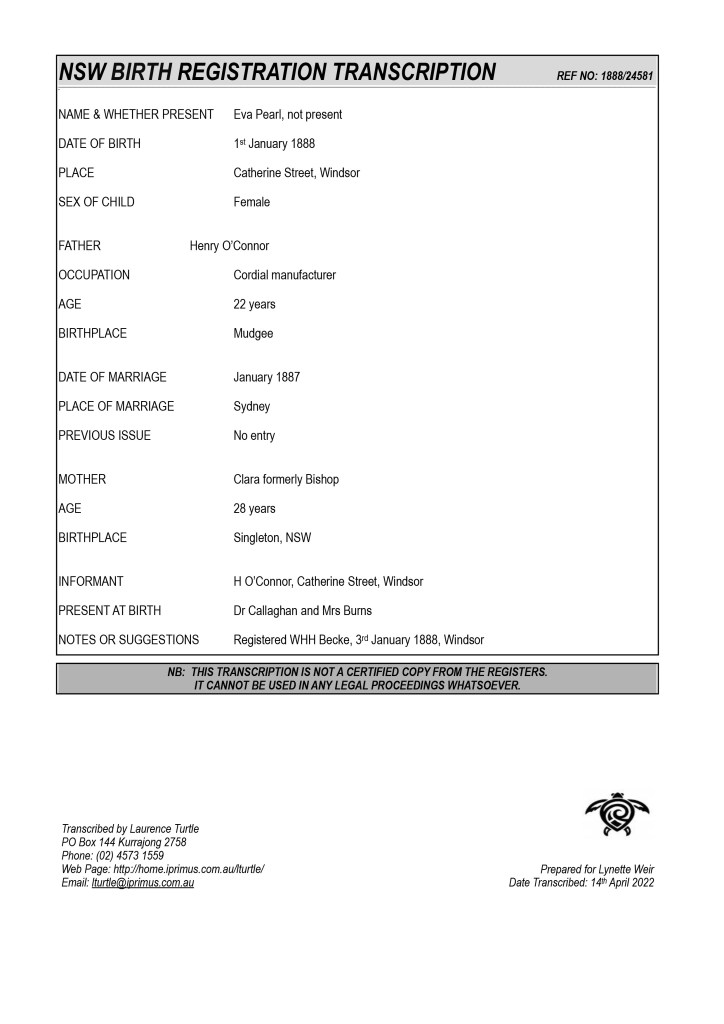 - NSW Birth Registration Transcription – Mary Grace Perkins REF: 16128/1915