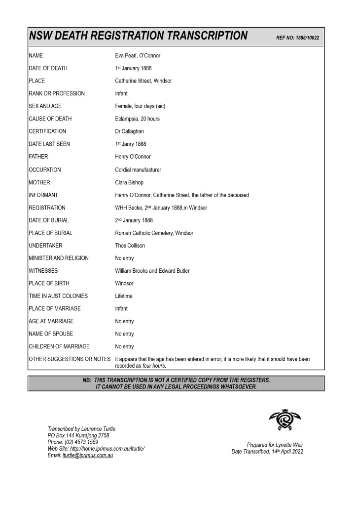 - d: 19 Mar 1959 Castlereagh Hospital Drummoyne