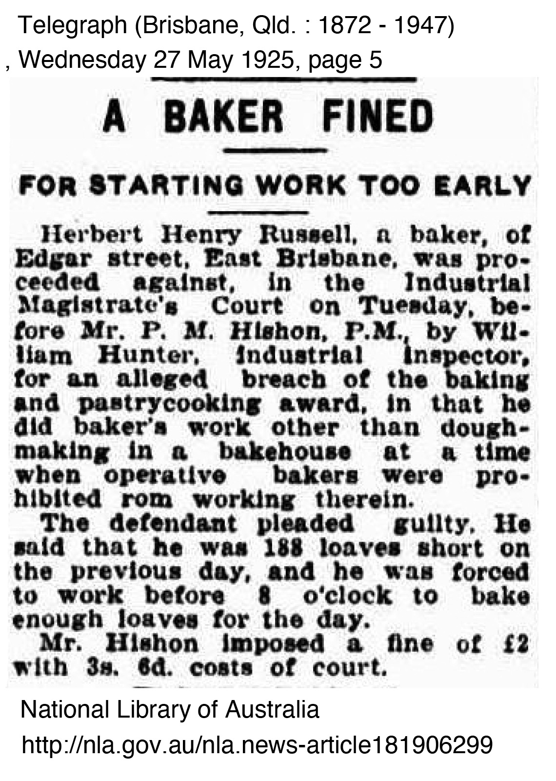 In the 1920’s Herb Russell was operating Bakery at Edgar St, Woolloongabba and managed to get himself into a bit of strife, working out of approved hours and selling bread on Sundays. The family story was that Annie May had a cake shop, it seems likely that this Bakery was her cake shop.